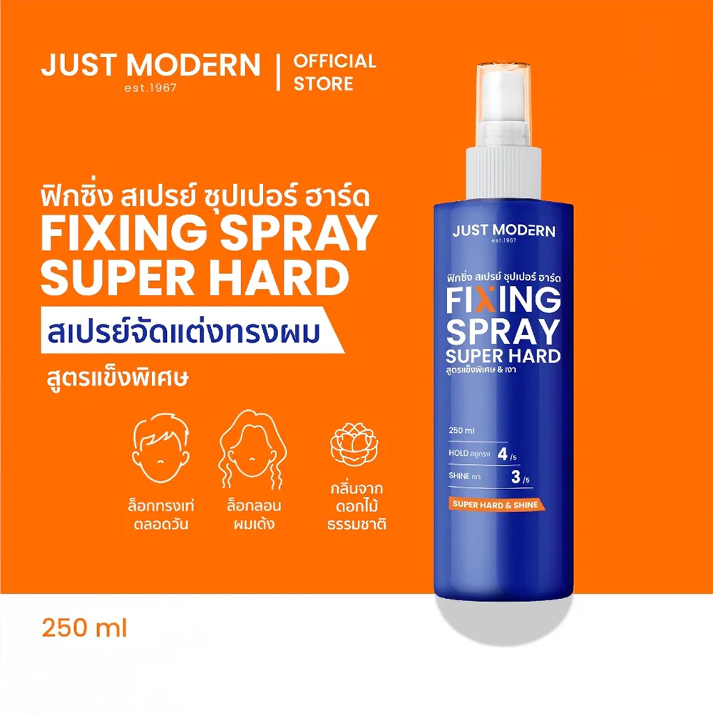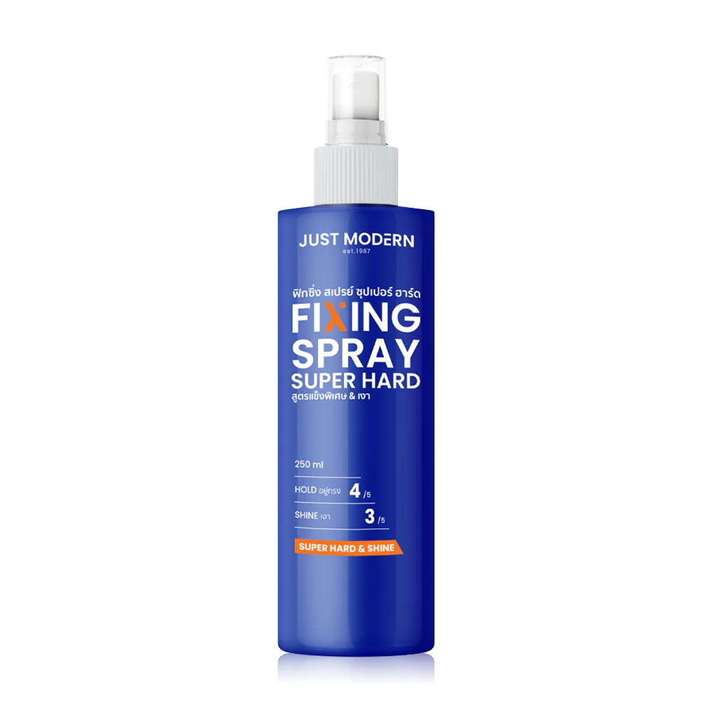 Just Modern Fixing Spray Super Hard 250ml This extra-hard formula hair gel spray is easy to use, dries quickly, doesn't clump, isn't sticky, and leaves no white residue. It helps lock in your hair's style all day long. It also combines Vitamin B5, Tea Tree Extract, and Mandarin Orange Extract to nourish your hair for a natural, shiny look.