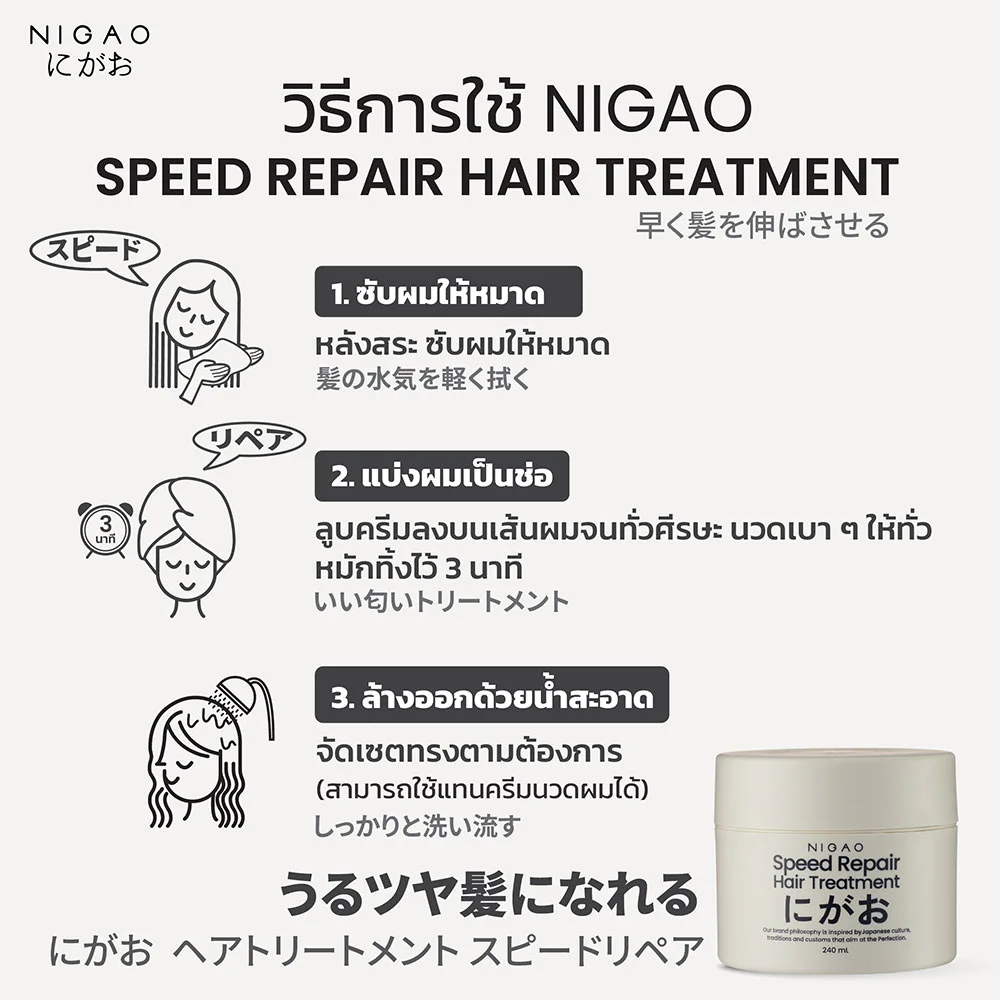 NIGAO Speed Repair Hair Treatment 240ml An effective hair and scalp revitalizing treatment with Sea Buckthorn plant extract that helps replenish collagen for stronger hair. Combined with lavender extract and vitamin B5, it helps retain water in the hair, making it moist and beautiful and healthier, with a gentle, natural fragrance.