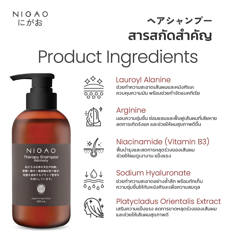 NIGAO Therapy Shampoo Harmony 300mlShampoo formulaExtra gentle for deep hair restorationBlended with a gentle aromatic scent Gives a feeling of relaxation, comfort to the scalp, makes hair soft, smooth, and looks weighty.