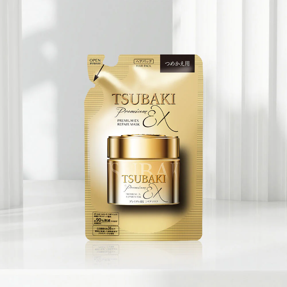 Tsubaki Premium Ex Repair Mask Refill 150g Beautiful, soft hair mask that makes hair shine and look more radiant Tsubaki's first Ionic Repair formula helps deeply absorb nutrients into the hair, especially damaged hair. Combined with Tsubaki's latest innovation, it has Damage Sensor Function technology. Helps take care of dry and damaged hair directly from the outer hair cuticles to the inside of the hair. Combined with Seal-in Intensive Repair, it helps continuously restore hair, allowing the nutrients to remain in each hair strand. Pamper and care for damaged hair for longer with the superior ingredients Golden Repair, which is 2 times more: Camellia Oil, Royal Jelly and Soy Protein, which are important for restoring soft and beautiful hair for smooth, soft, beautiful hair that shines with a classy luster, looking like it has an aura from the roots to the ends of the hair, as if it had been taken care of by a salon.