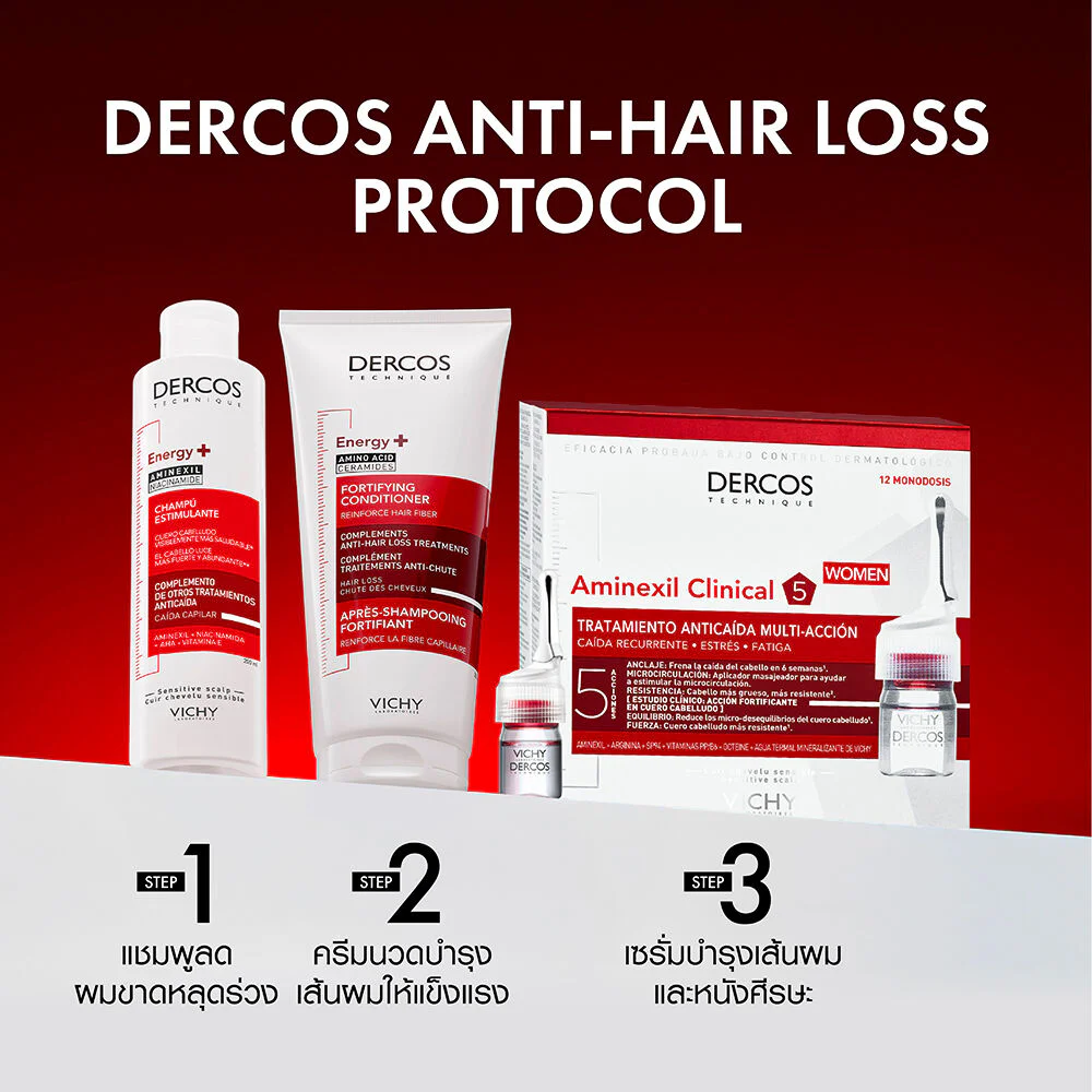 Vichy Dercos Energy + Fortifying Conditioner 200ml Hair conditioner for those with hair loss problems, combined with Aminexil, which has properties to reduce hair loss, along with Amino Acid and Ceramide, helps protect and nourish hair to be strong, healthy and shiny.