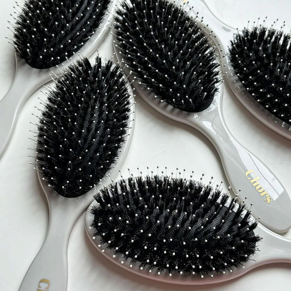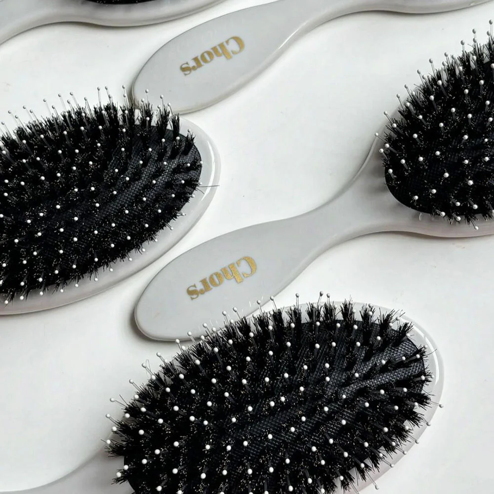 Chors First Step Hair Brush Natural Hair Brush Made from natural boar hair mixed with nylon bristles Helps distribute hair oils throughout the scalp Helps prevent tangling and leaves hair shiny and moisturized Gentle on hair and scalp Reduces hair loss, tangling, and difficult to style.