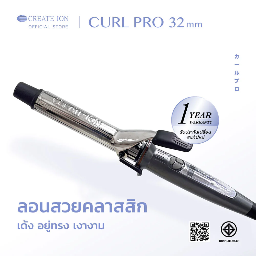 Create Ion Curl Pro 32mm Hair curler with a medium-sized barrel for classic and diverse curls with Ion Solutions Technology, a patented technology from Japan that helps create negative ions and push moisture into the hair's inner layer. It helps retain hair moisture for beautiful, professional curls that you can do yourself at home. It comes with a titanium barrel that heats up quickly, provides smooth, shiny, bouncy curls, is hydrated, healthy, and holds its shape all day long, and the Dual Ceramic Heater increases efficiency with a 2-layer heating plate, allowing the barrel to heat up quickly.