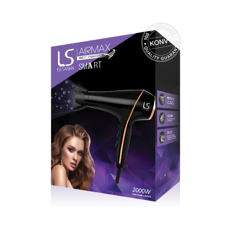 Le'sasha Airmax Smart Hair Dryer 2000w [LS1553]Great value hair dryer Helps to dry hair quickly in the blink of an eye.that comes with an ion release systemReduces static electricity on the hair to prevent frizz.and helps to condition the hair to be soft, beautiful, with weightno dryness