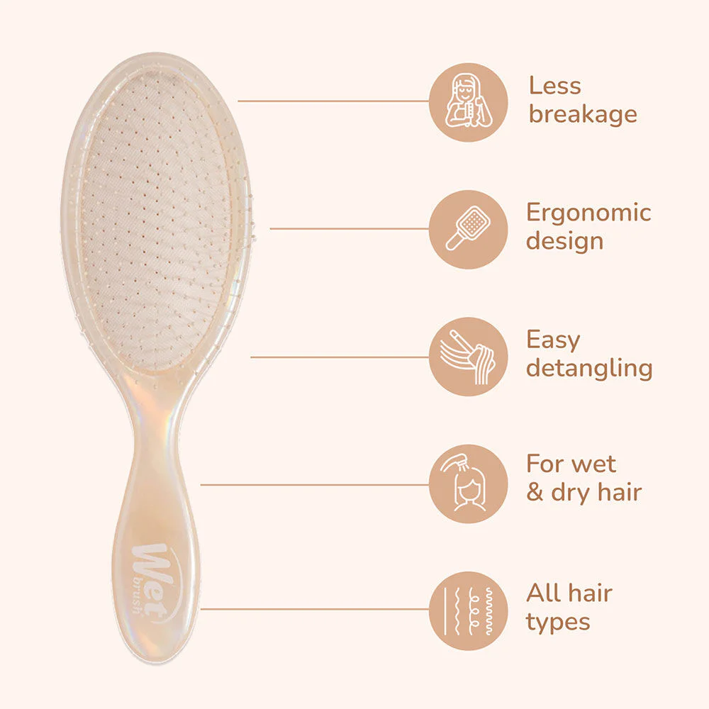 Wet Brush Detangler Duo Iridescence Cream Set Set of cream-colored oval brush combs, large and small sizes, protect hair and hair roots with Intelliflex bristle technology. Unique selling point of Wet Brush: The bristles are soft enough to comb hair. The button at the end of the brush is used to massage the head. It is smooth and helps to comb hair gently. Reduces the force used to comb hair by 55 %. Reduces hair loss by 45 %. Makes combing your hair happier. Portable size helps you comb your hair happily anytime, anywhere.
