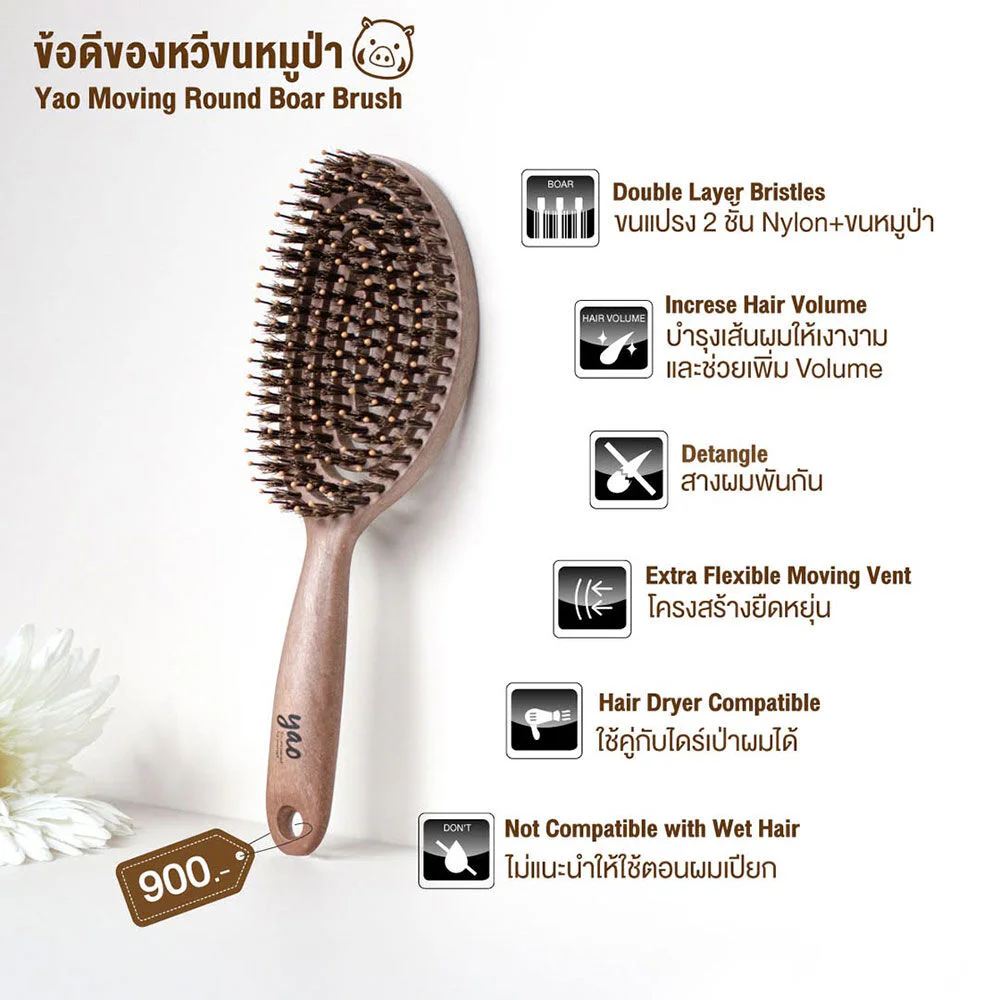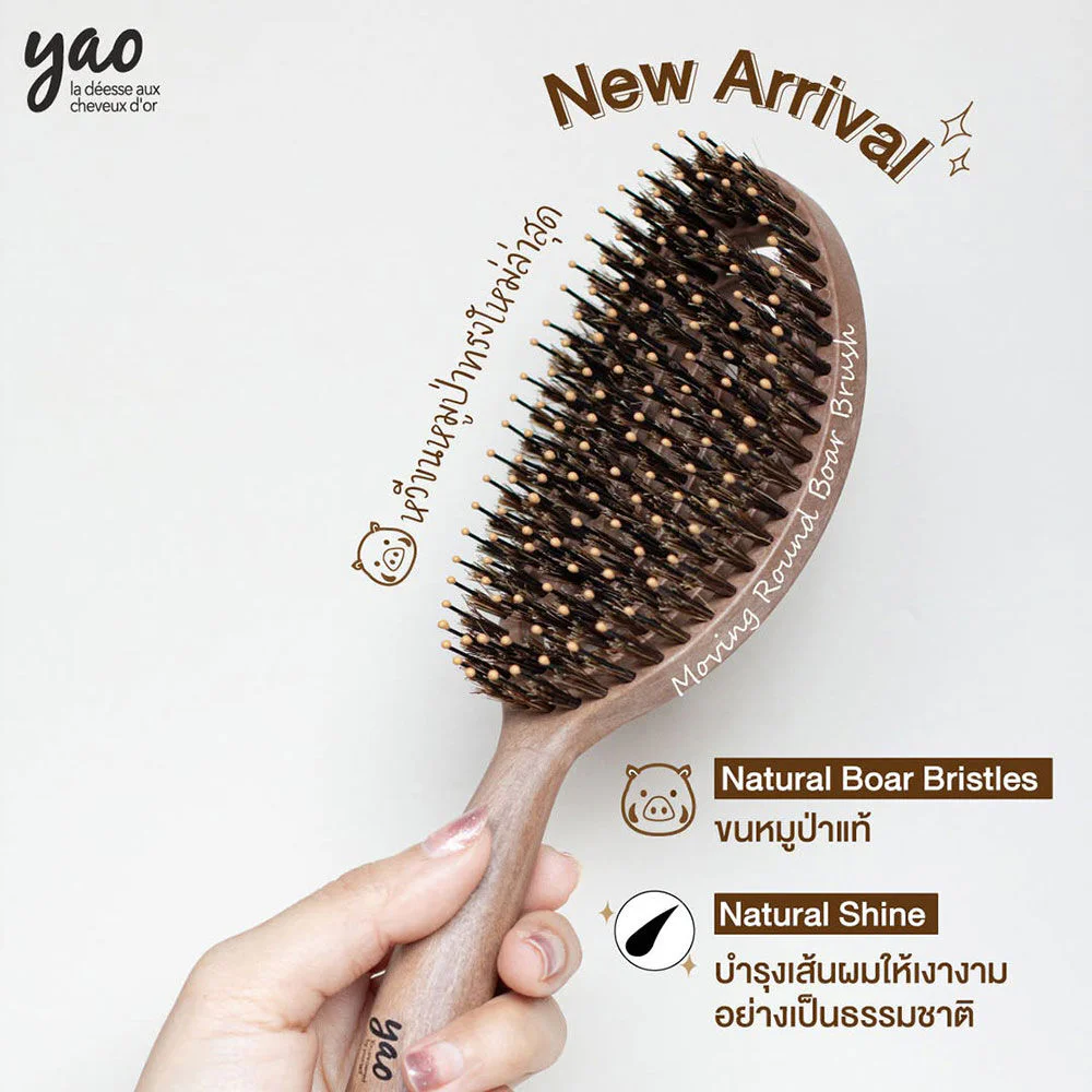Yao Moving Round Boar Brush 1pc Medium hair brush  Made from natural boar hairSuitable for all hair types. The oval and curved design follows the shape of the head, making it easy to grip. Designed specifically to help add volume to hair. Can comb through tangled hair without pulling the hair and causing hair loss.