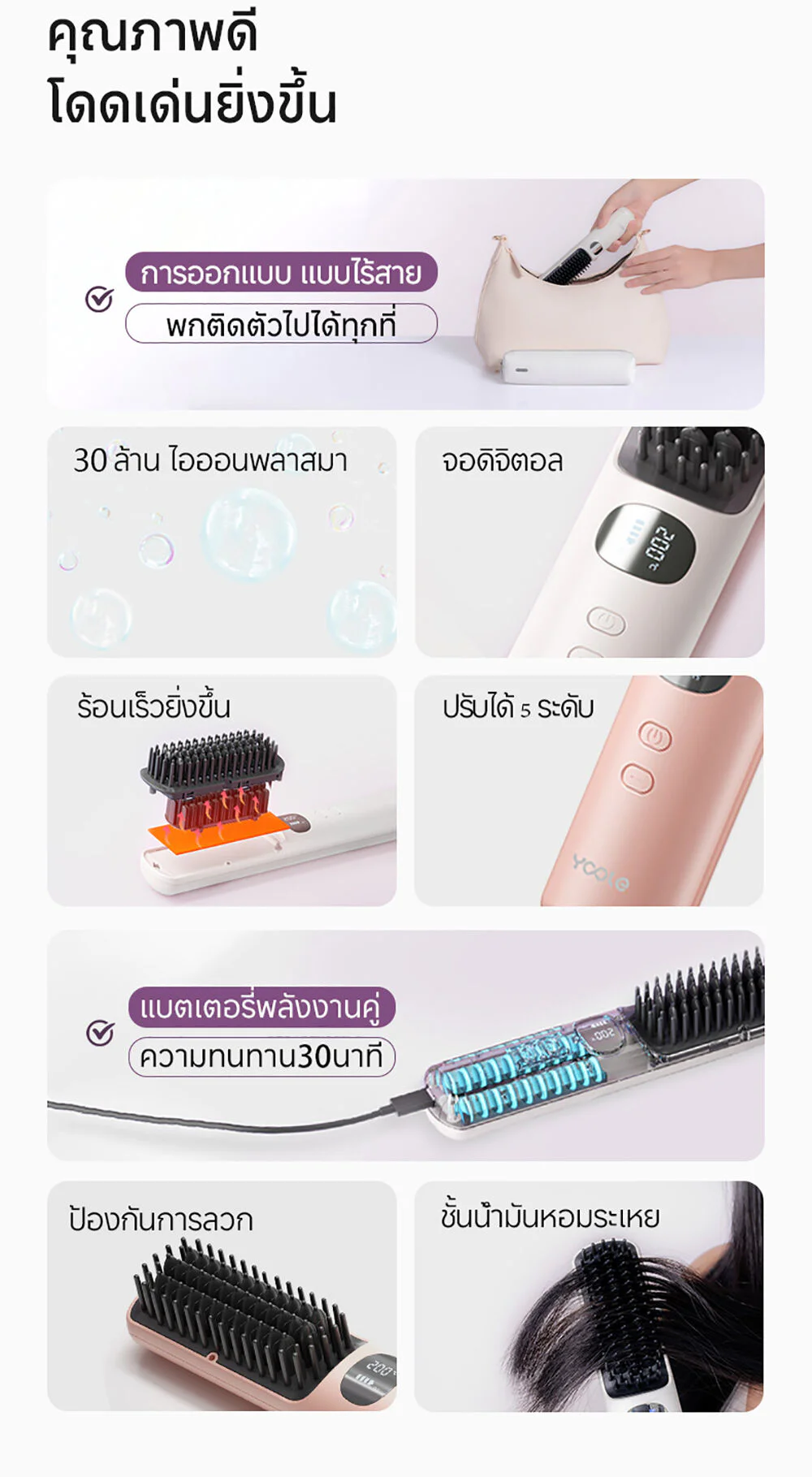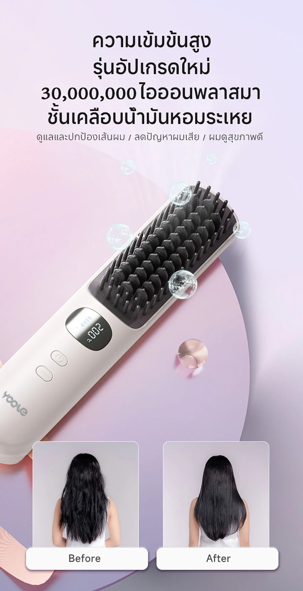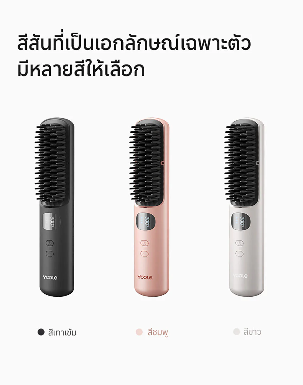 Yoole Hair Straightening Brush 1pc #White This white, cordless electric comb can heat up to 200 degrees and has 5 temperature settings. It comes with intelligent temperature control technology and has over 30 million ion charges, helping to prevent frizz, making hair shiny and straight. It also has a digital temperature display, making it portable and allowing you to change your look in many different styles.