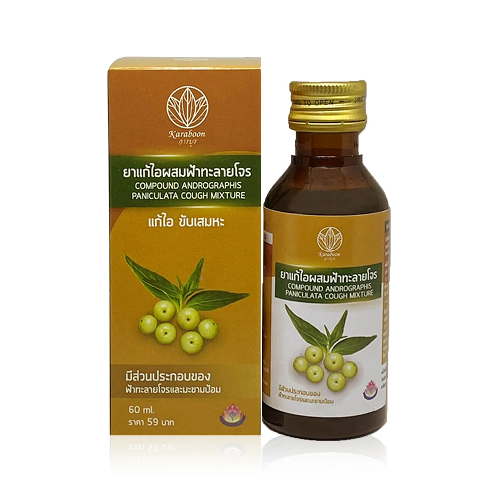 Karaboon Compound Andrographis Paniculata Cough Mixture 60mlcough syrupDrive smoothly.and reduce sore throatContaining ingredients of Thai herbs such as Andrographis paniculata, Indian gooseberry and licorice root. The taste is cool and soothing.