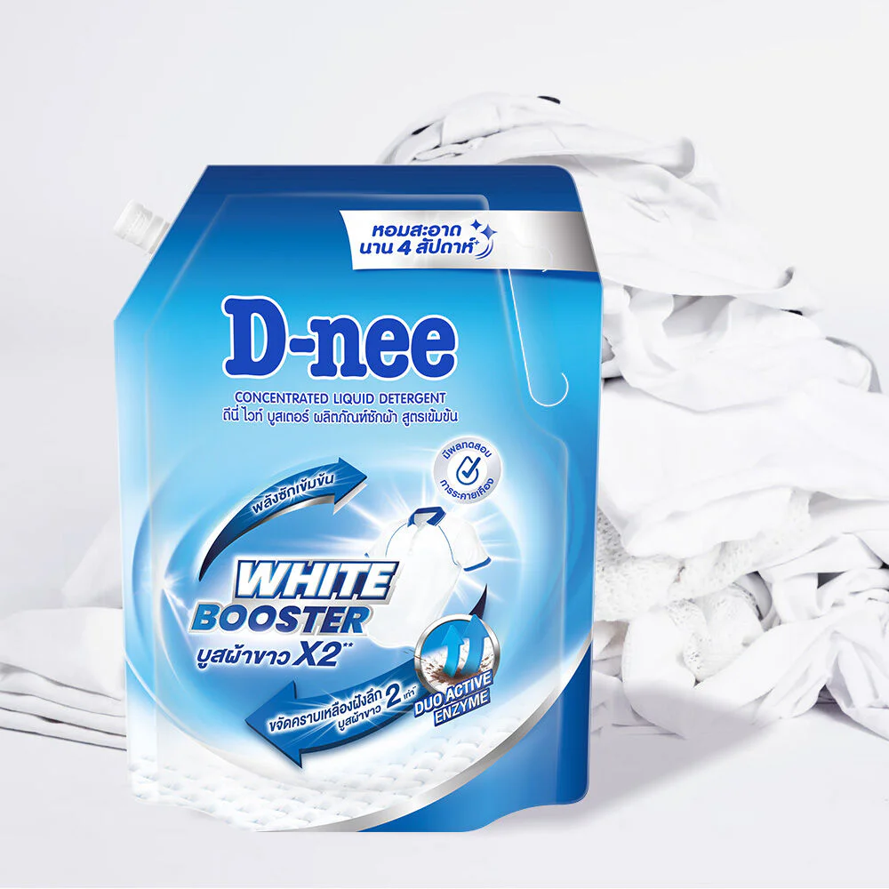 D-nee Concentrated Liquid Detergent White Booster 1200ml Concentrated fabric cleaner helps remove deep yellow stains and protects clothes from musty odors. Comes with Duo Active Enzyme technology that helps remove 9 stubborn stains, making clothes white and clean again, with a long-lasting clean scent.
