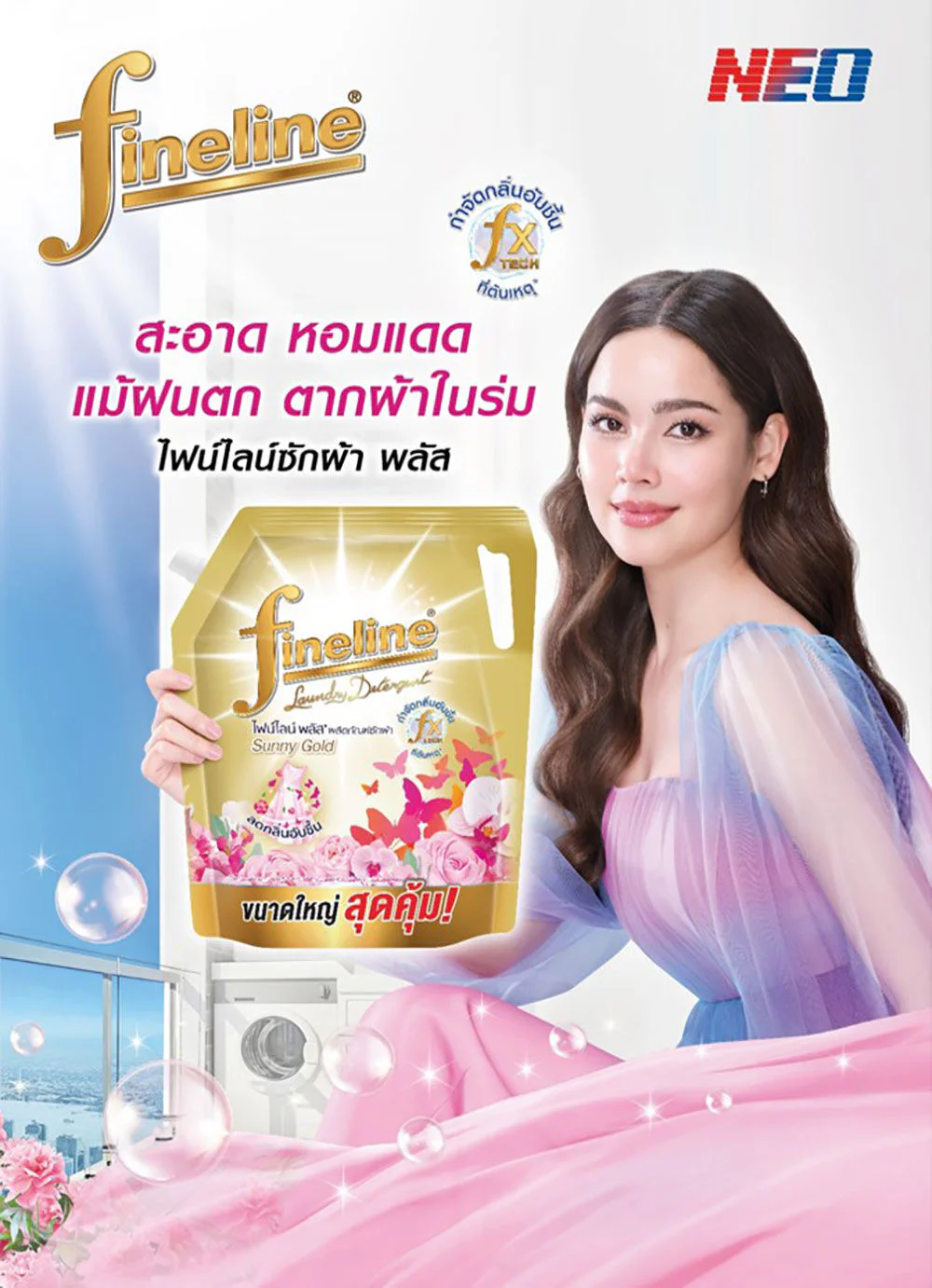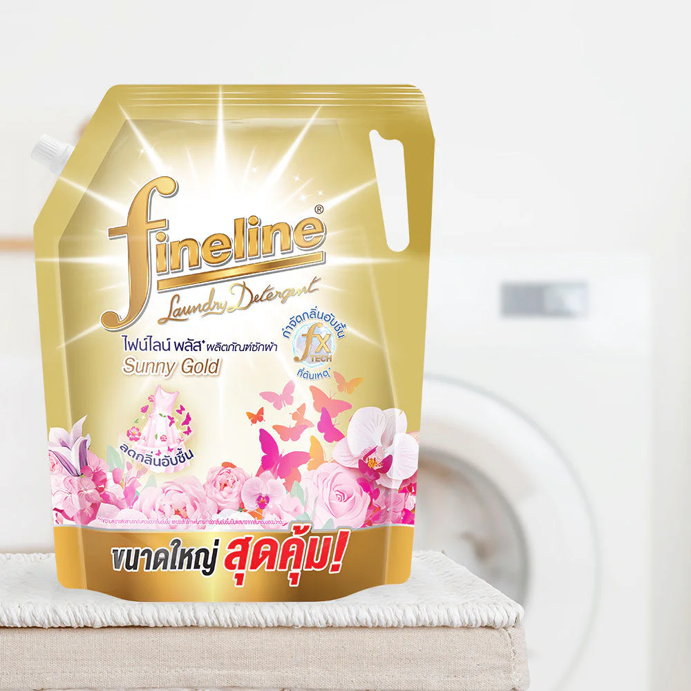 Fineline Laundry Detergent Plus Sunny Gold 1850ml Fabric cleaning product with a formula that reduces musty odors, even when washing during the rainy season, washing at night, or drying indoors. Sunny Gold scent can clean all types of fabrics, is easy to rinse, does not leave white stains, and has a long-lasting fragrance.