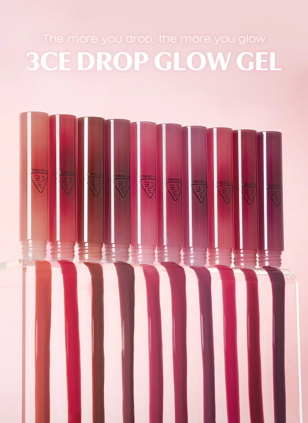 3CE Drop Glow Gel 4g #Shy A lightweight, jelly-textured lip tint that feels comfortable on the lips and is not sticky. It is combined with nourishing ingredients that help keep the lips soft, moist, and not dry. It gives the lips a beautiful, shiny, and full color.