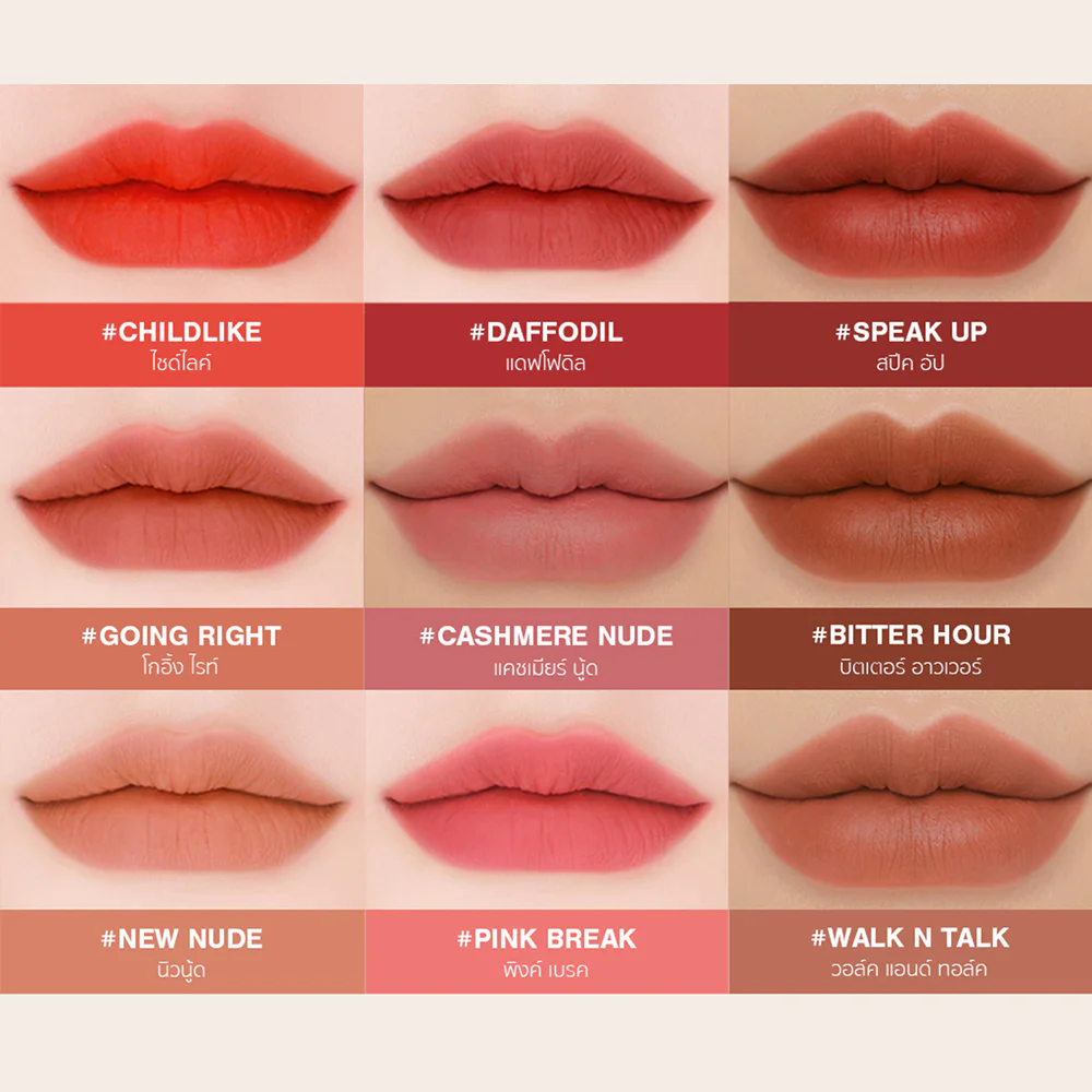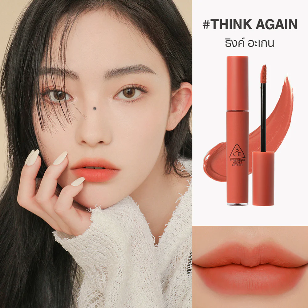 3CE Velvet Lip Tint 4g #Think Again Velvety soft lip tint with dense pigments that last long, giving a matte finish. Contains oils that help moisturize and fill in lip lines, giving lips a beautiful, soft color that looks full and lively.