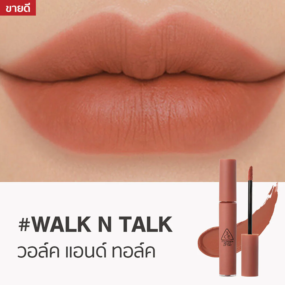 3CE Velvet Lip Tint 4g #Walk N Talk Velvety soft lip tint with dense pigments that last long, giving a matte finish. Contains oils that help moisturize and fill in lip lines, giving lips a beautiful, soft color that looks full and lively.
