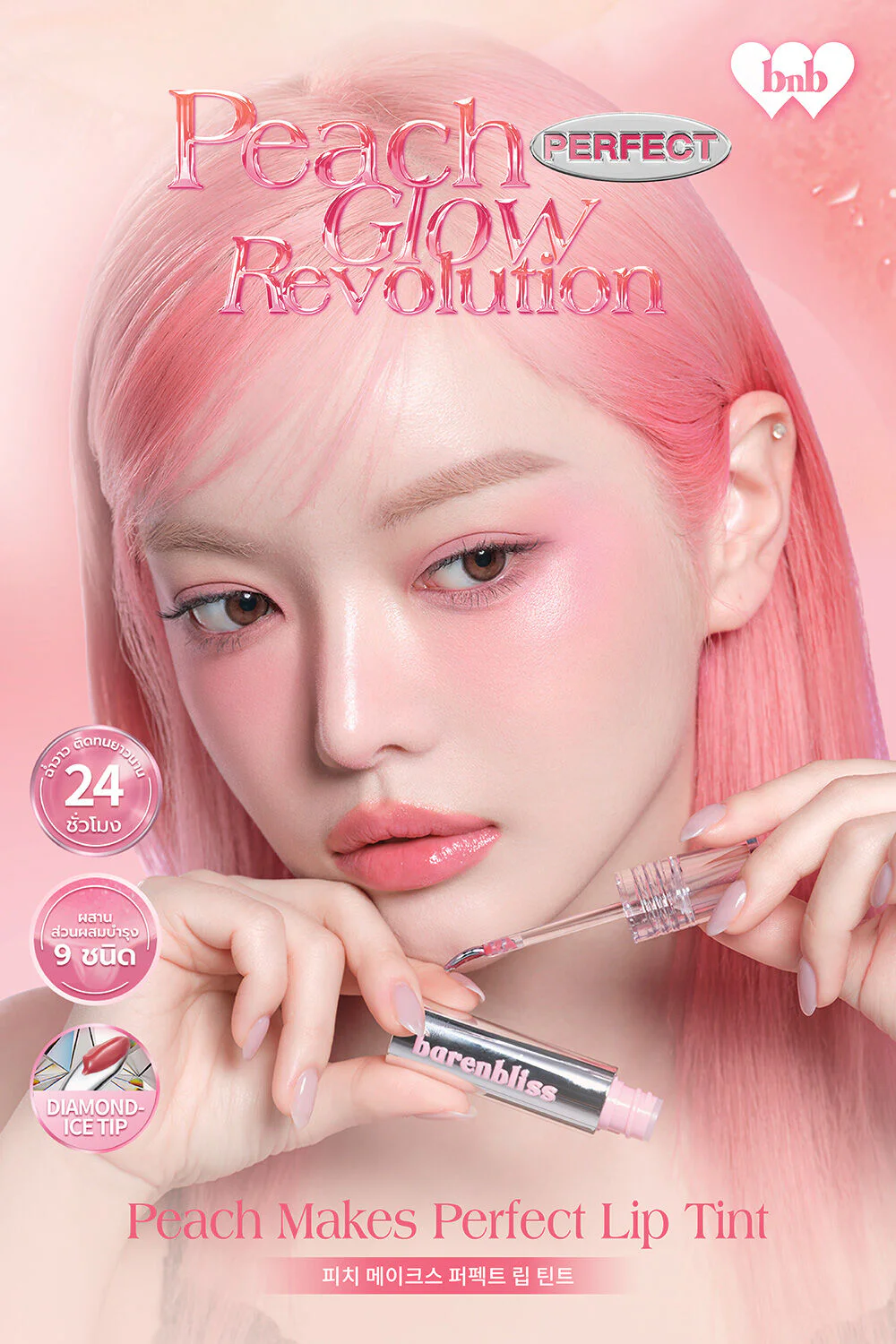 barenbliss Peach Makes Perfect Lip Tint 3g #S15 Cool Summer Glossy lip tint with clear pigments, long-lasting with Aqualon™ EC Color-Lock technology, combined with 9 types of nourishing ingredients, helps nourish the lips to be smooth, soft, moist, comes with a specially designed steel brush head, making it easier to apply the lipstick and giving a cool touch, giving beautiful, shiny, healthy-looking lips.