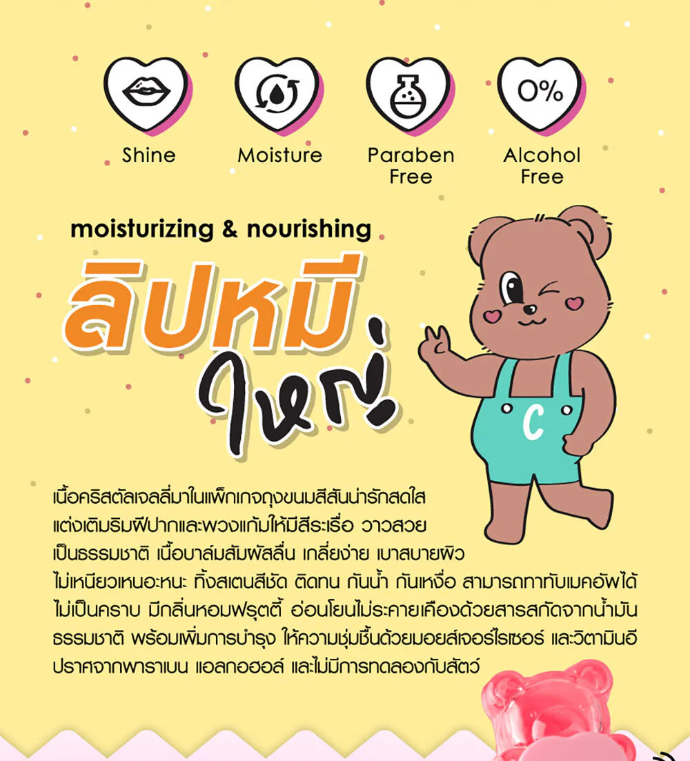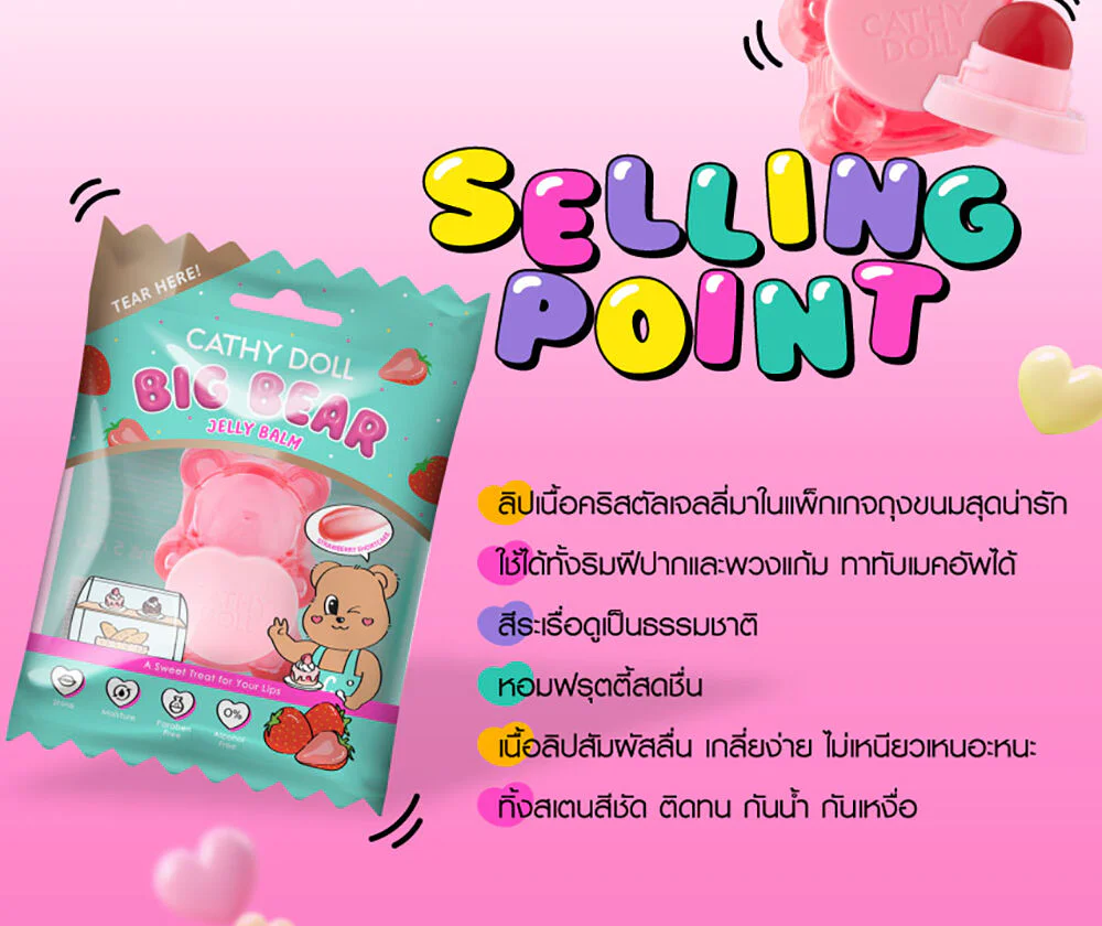 Cathy Doll Big Bear Jelly Balm 5g #Green Apple SmoothieBig Bear Lip, crystal jelly texture, comes in a cute and brightly colored candy bag package. Add a natural, beautiful, shiny color to your lips and cheeks. The balm texture is smooth, easy to spread, light on the skin, not sticky, leaves a clear color stain, is long-lasting, waterproof, sweatproof, can be applied over makeup without smudging. Has a fruity scent, gentle, non-irritating with natural oil extracts, and adds nourishment and moisture with moisturizer and vitamin E.