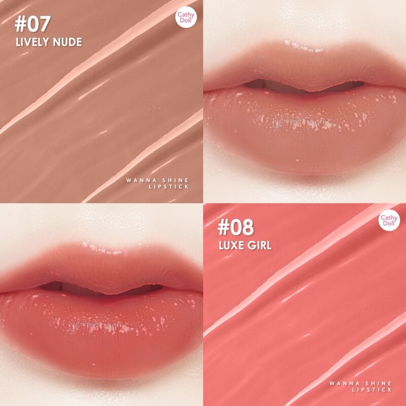 Cathy Doll Wanna Shine Lipstick 3g #07 Lively Nude Glossy lipstick with a smooth touch and adds color to the lips to look naturally radiant. Change dark lips to look healthy with the nourishing value of almond oil, grape seed oil and hyaluronic acid. Makes the lips look plump, smooth, not dry. It also includes many vitamins and omegas that help retain moisture as if restored. Makes the lips look radiant and full of water all day long. Gives a soft, charming scent.