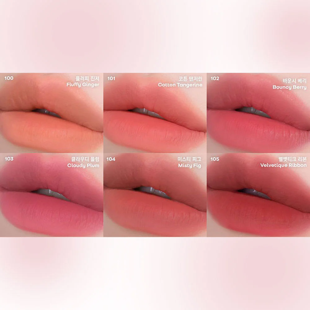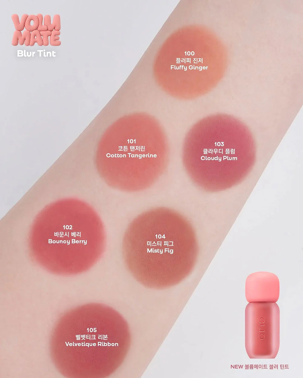 CLIO Volumate Blur Tint 3.8g #102 Bouncy Berry This matte lip tint gives a soft, fluffy matte touch. The pigments are intense and blend easily without settling into lip lines. It blurs the lips for a smooth, natural finish. It also contains Vitamin E and Glycerin to nourish and moisturize the lips for a long time. It provides beautiful color and makes the lips look plump and touchable.