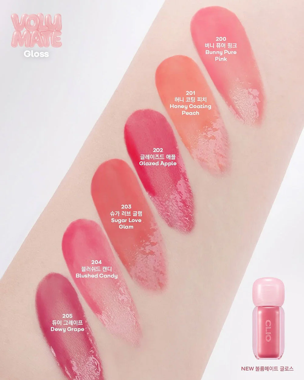 CLIO Volumate Gloss 3g #202 Glazed Apple This glossy lip tint has a smooth, syrupy texture that's easy to spread and non-sticky. It blurs lip lines for a smoother look, while also providing a plumping effect to fill in lip lines for a fuller look. It also delivers a beautiful, glowing Syrup Shine color for plump, kissable lips.