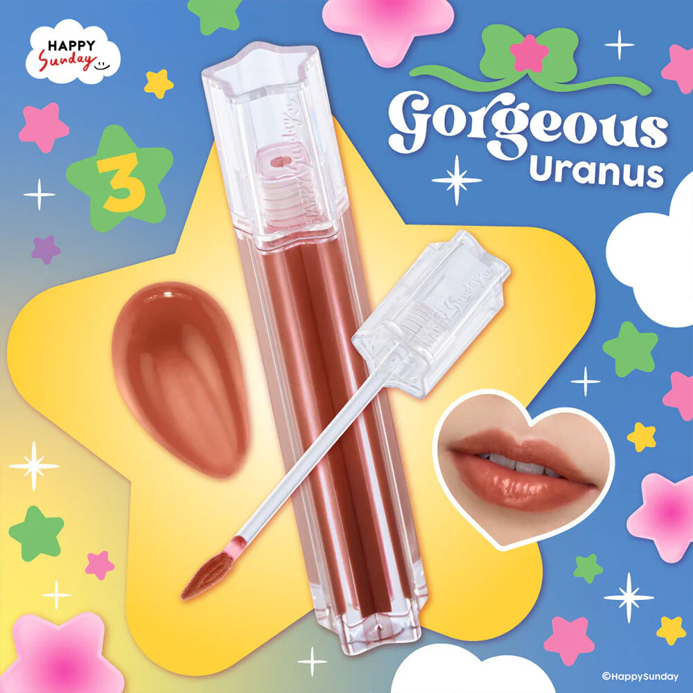 HAPPY SUNDAY Glassy Wow Lip Tint 3.5g #3 Gorgeous Uranus Lip Tint Gloss, light texture, clear color, no stains, no stickiness, long-lasting, combined with hyaluronic acid, helps nourish the lips to be smooth, moist, not dry and flaky, with extracts that help nourish the lips to not be dark, giving beautiful, shiny, healthy-looking lips.