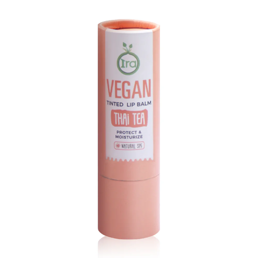 IRA Vegan Tinted Lip Balm Thai Tea 5g Tinted lip balm nourishes your lips, helping your lips look soft with a combination of shea butter, cocoa butter and candelilla wax, combined with sweet almond oil, macadamia nut and jojoba, helping to retain moisture for lips for up to 6 hours, reducing dark lips with vitamin E, with color from natural minerals making the lips look lively and healthy.