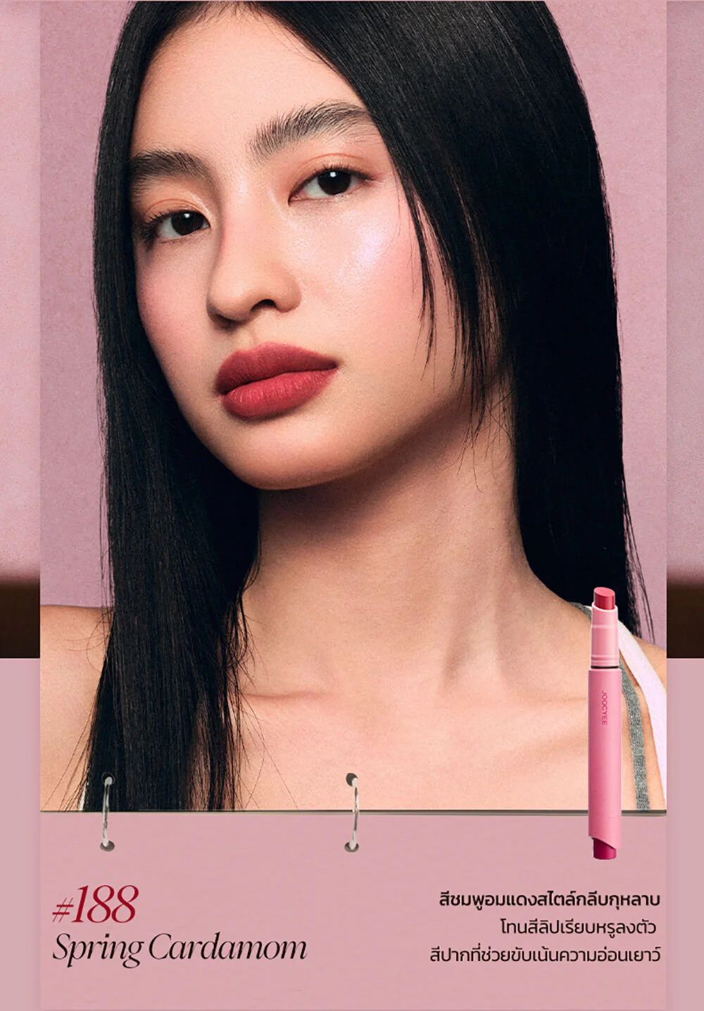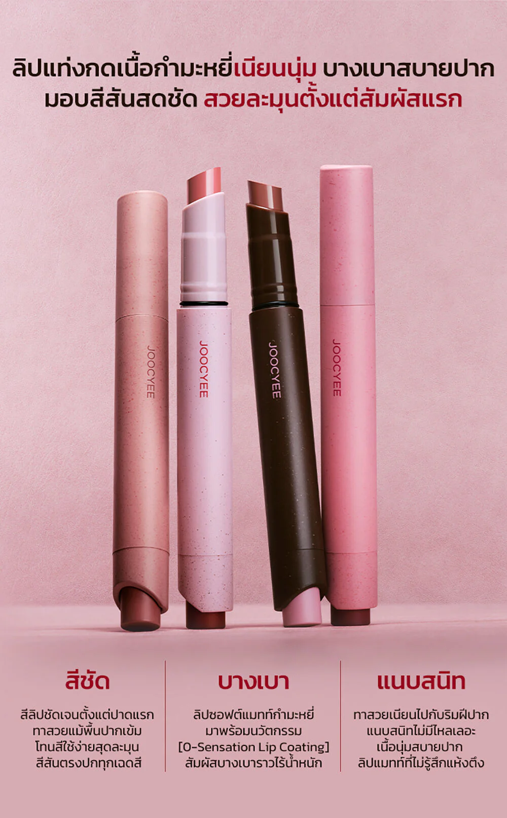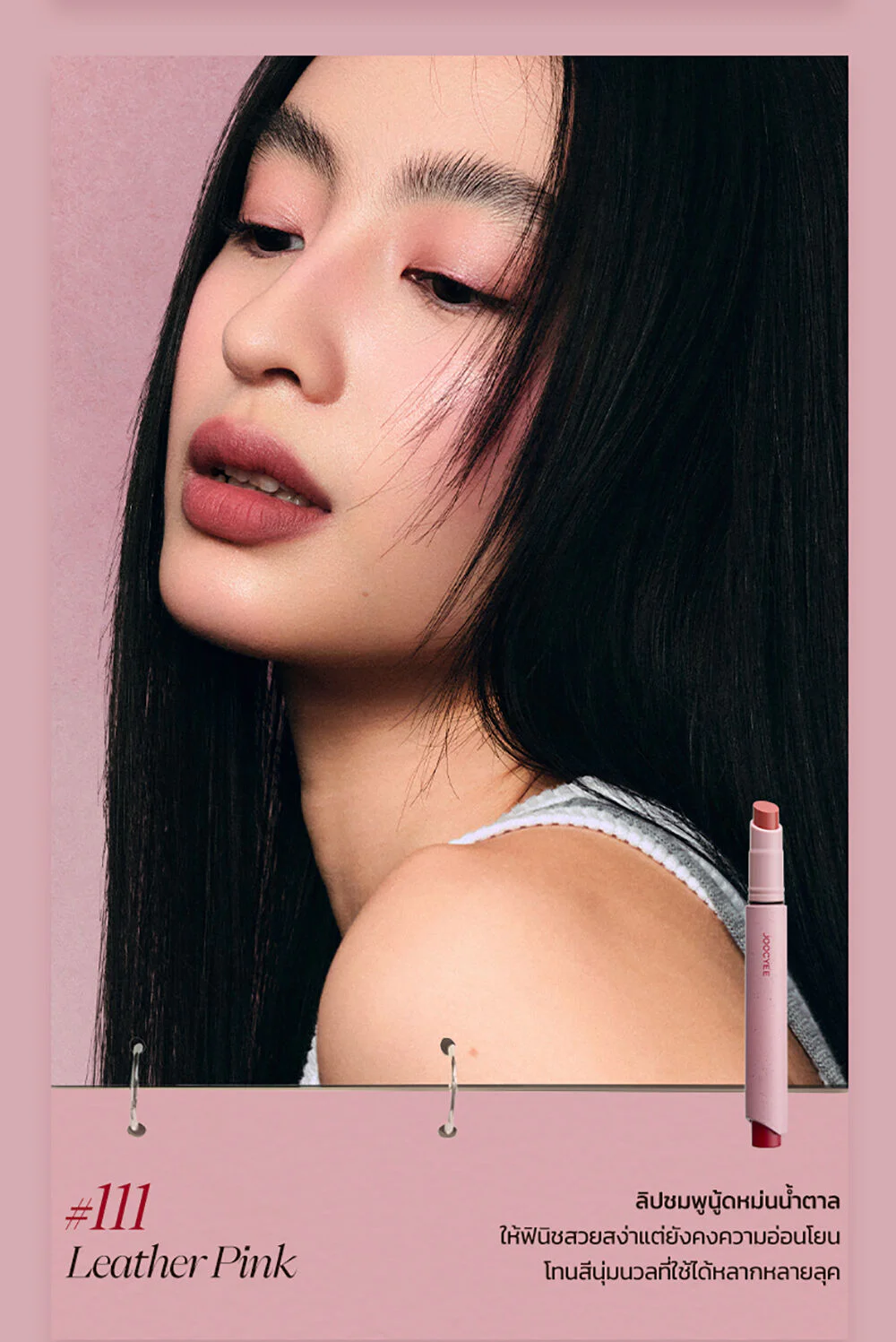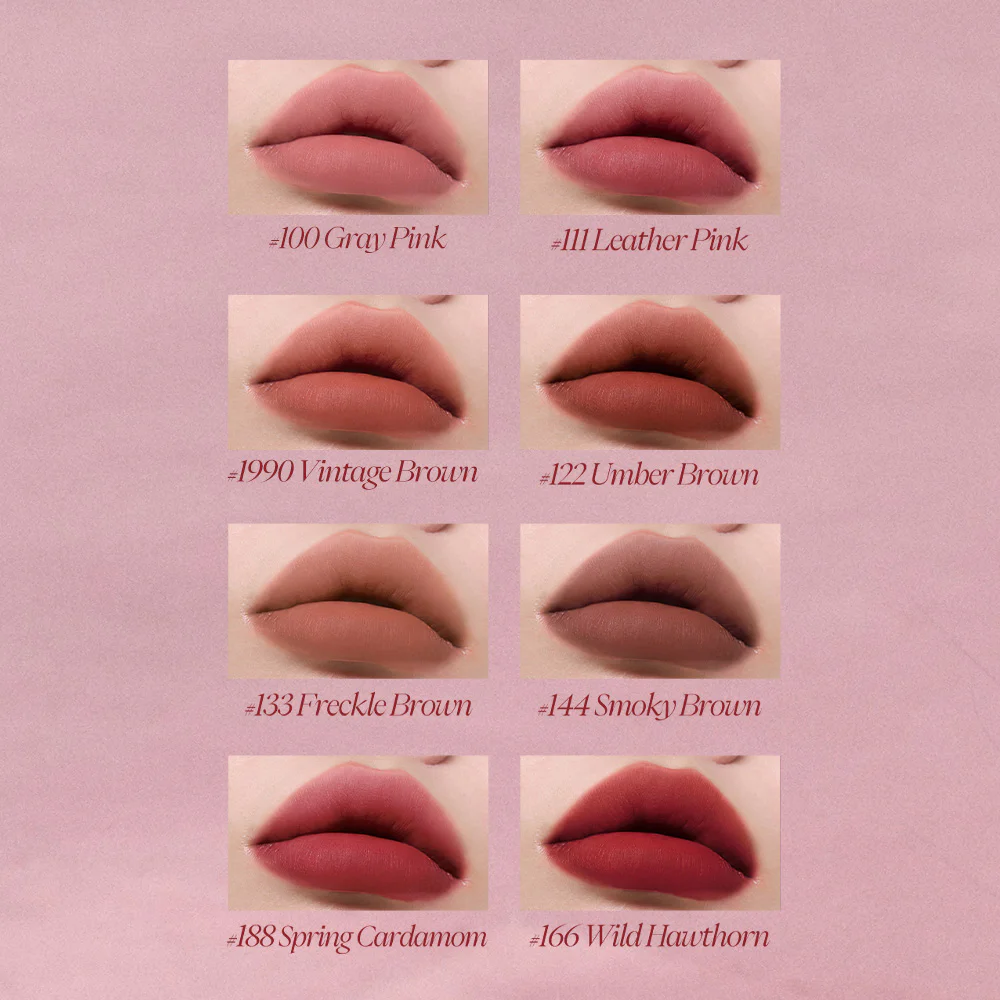 JOOCYEE Velvet Rouge 3g #100 Gray Pink Soft matte lip in a press pen form, comes in a concept of vintage tones that are super chic, super soft with brown-pink tones, soft velvet texture, comes with the innovation 0-Sensation Lip Coating, light touch like weightless, easy to apply, comfortable on the lips, beautiful, clear lip color from the first touch, the color is true to the cover, beautiful application even with dark lips, beautiful and smooth on the lips, adheres perfectly, no smudging, does not make you feel dry and tight, gives the lips a soft, smooth look, beautiful shades, complete, easy to choose, can be used on all skin tones