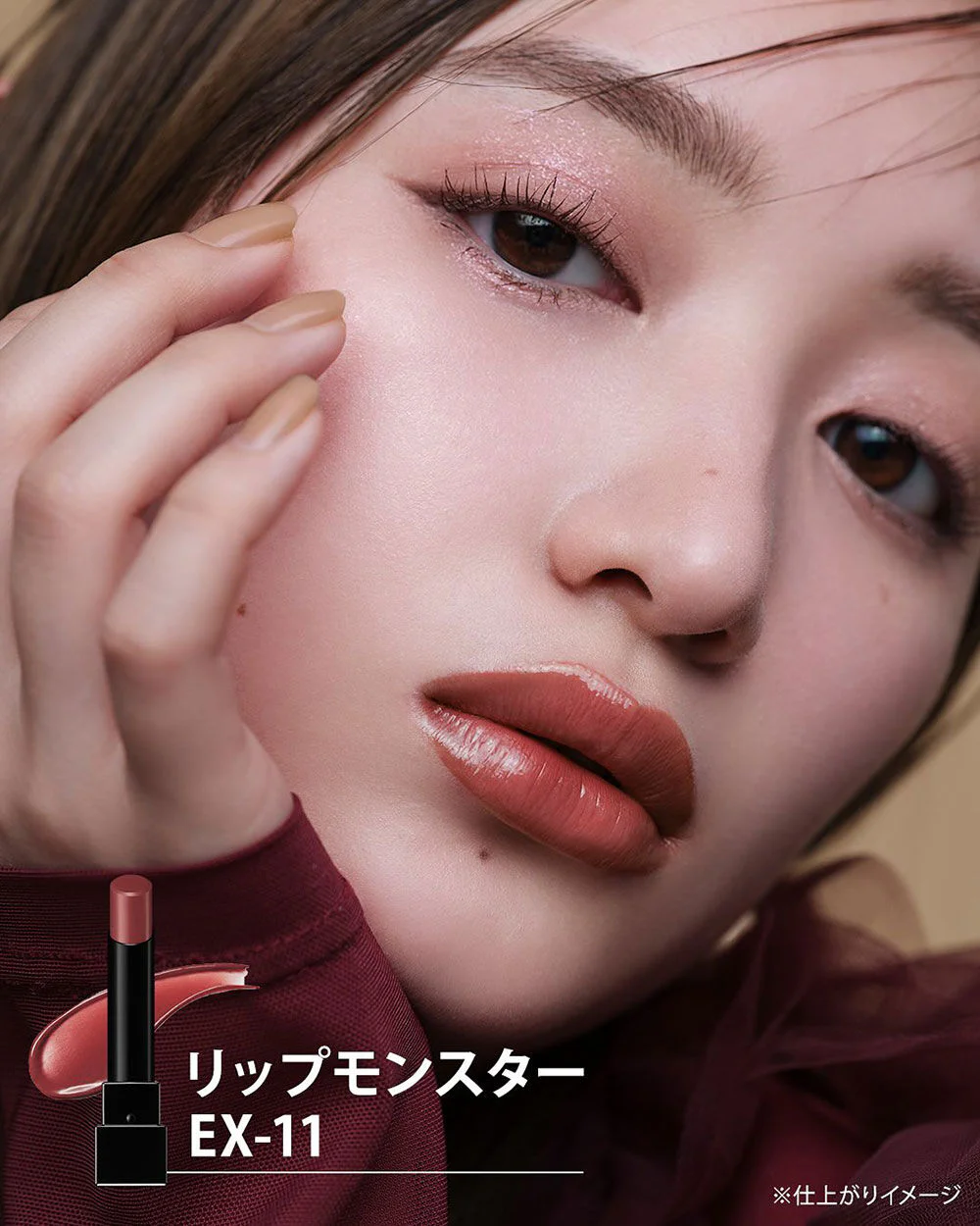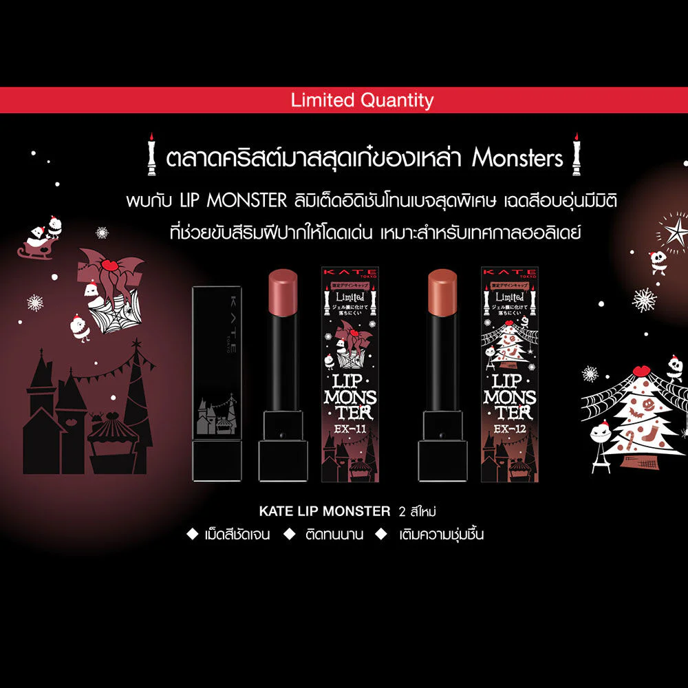 KATE Lip Monster 3g #EX-11 Red Smoke in the Gift This lipstick is intensely pigmented, long-lasting, and moisturizing, without drying out. This limited-edition model features a special beige tone that adds color to your lips, making them stand out and plump more than ever before. Its warm, dimensional shades help to make your lips stand out even more. It features special technology that transforms into a film that coats your lips after application, helping to maintain clear, fade-proof color all day long.
