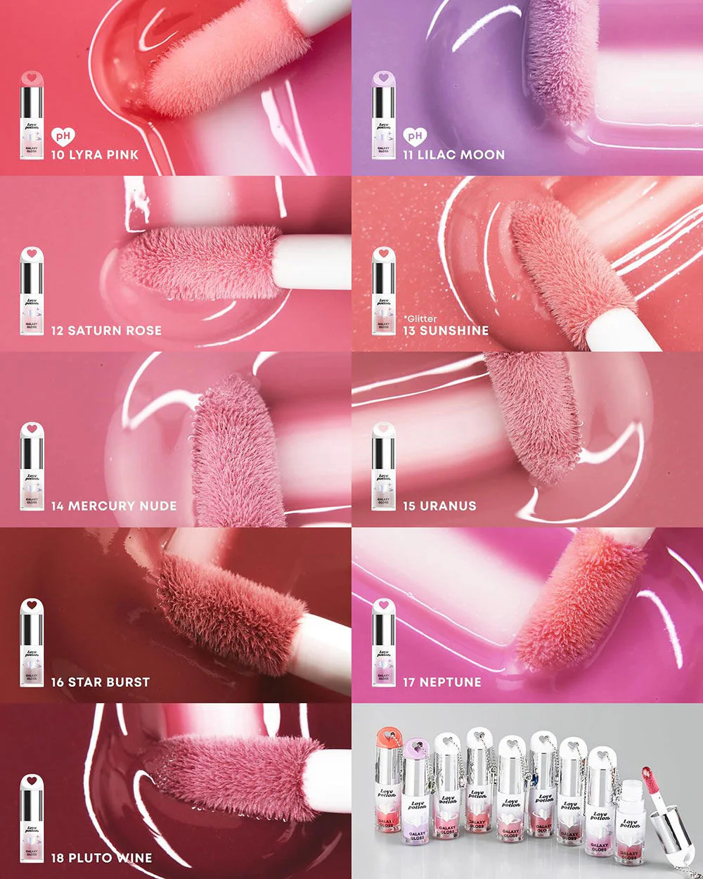 LOVE POTION Galaxy Gloss 3g #18 Pluto Wine This glossy, mirror-like lip oil nourishes with Hya Encapsulation, a special technology that helps fill in deep lip lines and lock in long-lasting moisture. It reduces dryness and helps restore lips from pollution, while protecting and moisturizing for full, beautiful lips without stickiness. It comes with a decorative hanging charm. Win a secret prize with every random draw!