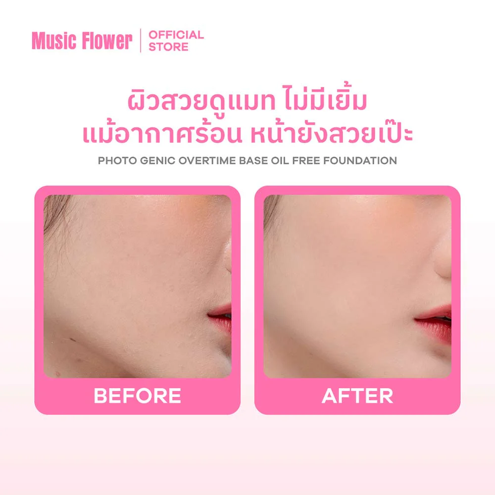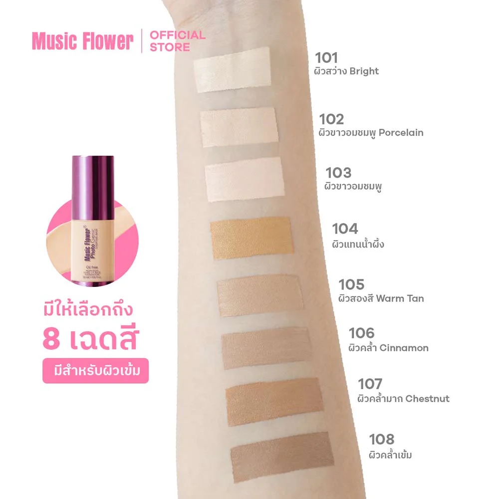 Music Flower Photo Genic 30ml #104 Creamy foundation, soft and smooth, easy to spread, waterproof, sweatproof, oil control, no stains, not sticky, long-lasting, helps blur pores, conceals acne scars, dark spots and uneven skin tone, provides a matte finish, smooth, glowing, healthy look.