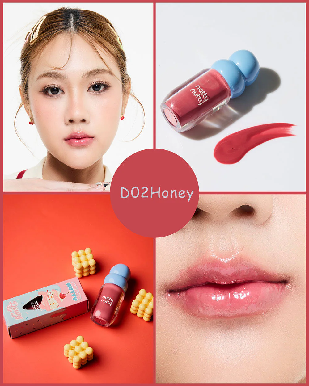 Nattynutty Cosmetics Dewy Lip Oil 3.5g #D02 Honey Lip oil in 5 shades that can be matched with every look. Rich pigments give a healthy, glossy look to the lips, while nourishing the lips to be soft all day long.