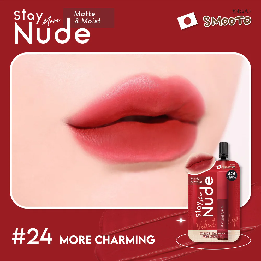 Smooto Stay More Nude Velvet Lip 2g #24 More Charming Velvet lipstick, beautiful and clear pigment, covers lip color, long-lasting, does not fall into grooves, does not stick to the mask, combined with shea butter, hyaluronic acid and vitamin E, helps moisturize the lips, giving a matte finish but not dry, confident all day long.