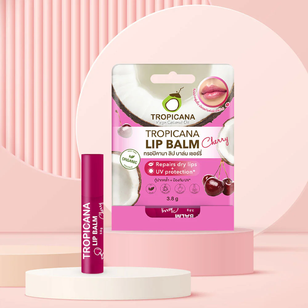 Tropicana Lip Balm 3.8g #Cherry Coconut Oil Lip Balm Cherry Scent is rich in organic cold-pressed coconut oil, cocoa butter and shea butter to help nourish dry and cracked lips to become moist again. With vitamin C and vitamin E, it helps to make lips soft and healthy.