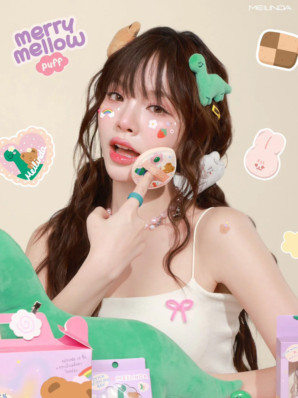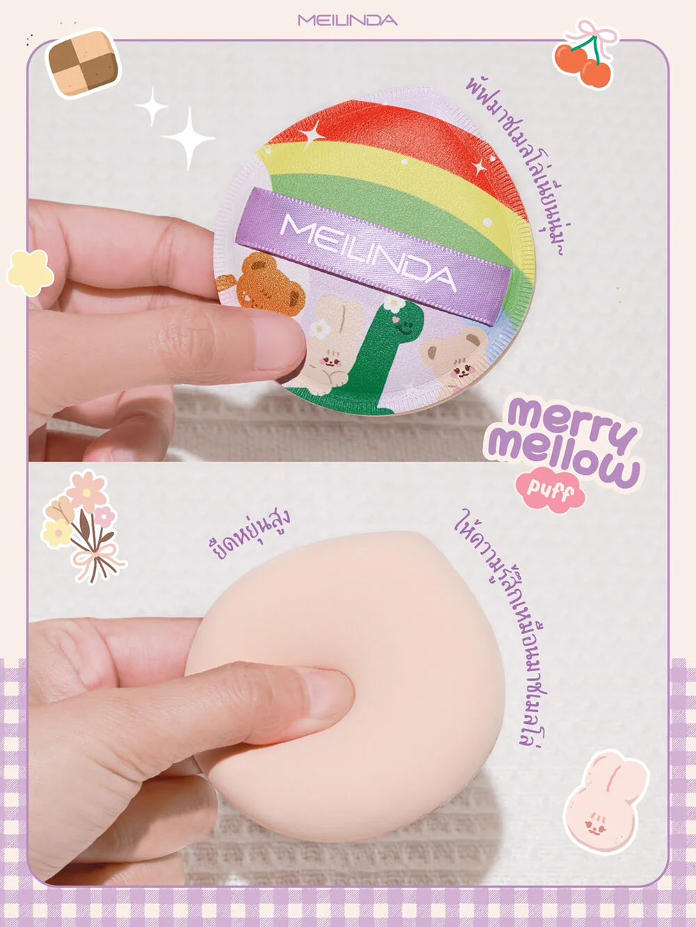 Mei Linda Merry Mellow Puff 1pc #01 Peach A very special puff collection that Mei Linda has collaborated on designing with stickwithme4ev cute cartoon patterns on puffs that have a soft, bouncy texture like marshmallows. They are very flexible, easy to use, and do not irritate the skin. They make spreading foundation easier. They can be used with cream and liquid products. They have a pointed water drop shape, making them easy to use and capture details on the face.