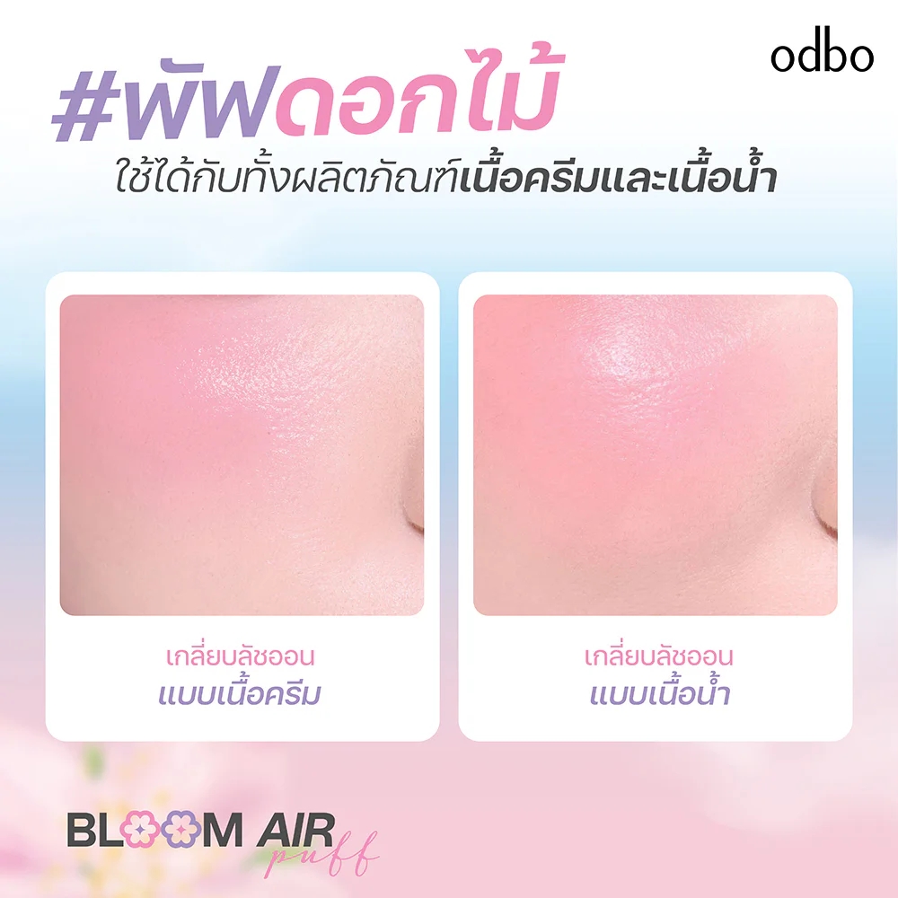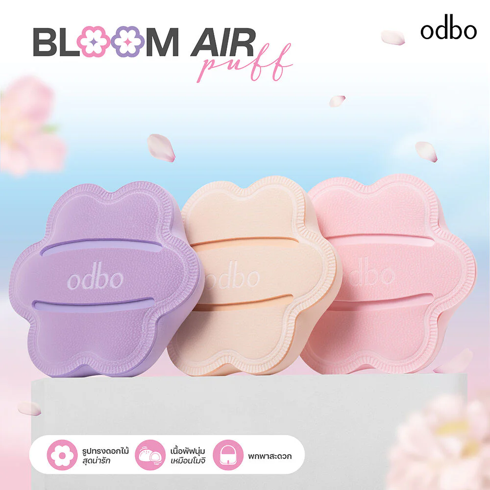 ODBO Bloom Air Puff 1pc #8076-03 This adorable flower-shaped, cream-colored makeup air puff is specially designed for flexibility. Its fine, thick, and soft texture feels like mochi, blending makeup smoothly without absorbing product. It ensures makeup lasts longer, adheres closely to the skin, and doesn't smudge. It can be used with both cream and liquid products, such as foundation, cushion, cream blush, concealer, or contour, for a naturally smooth, beautiful look that lasts all day.