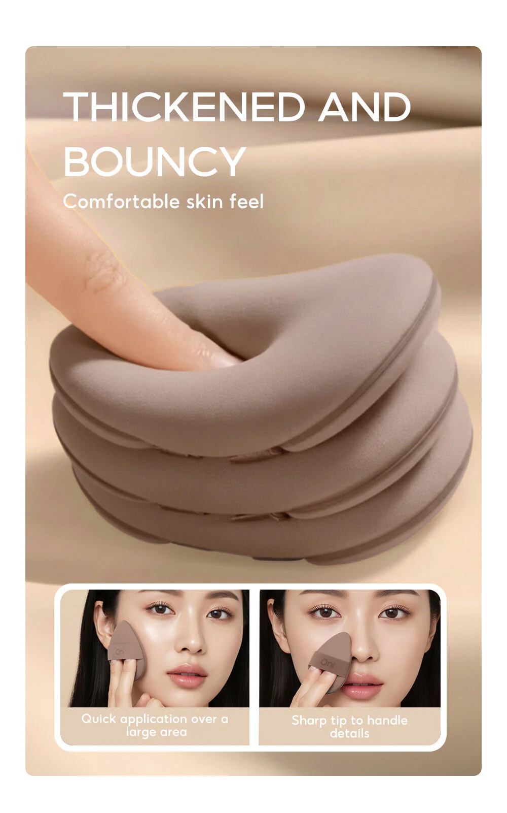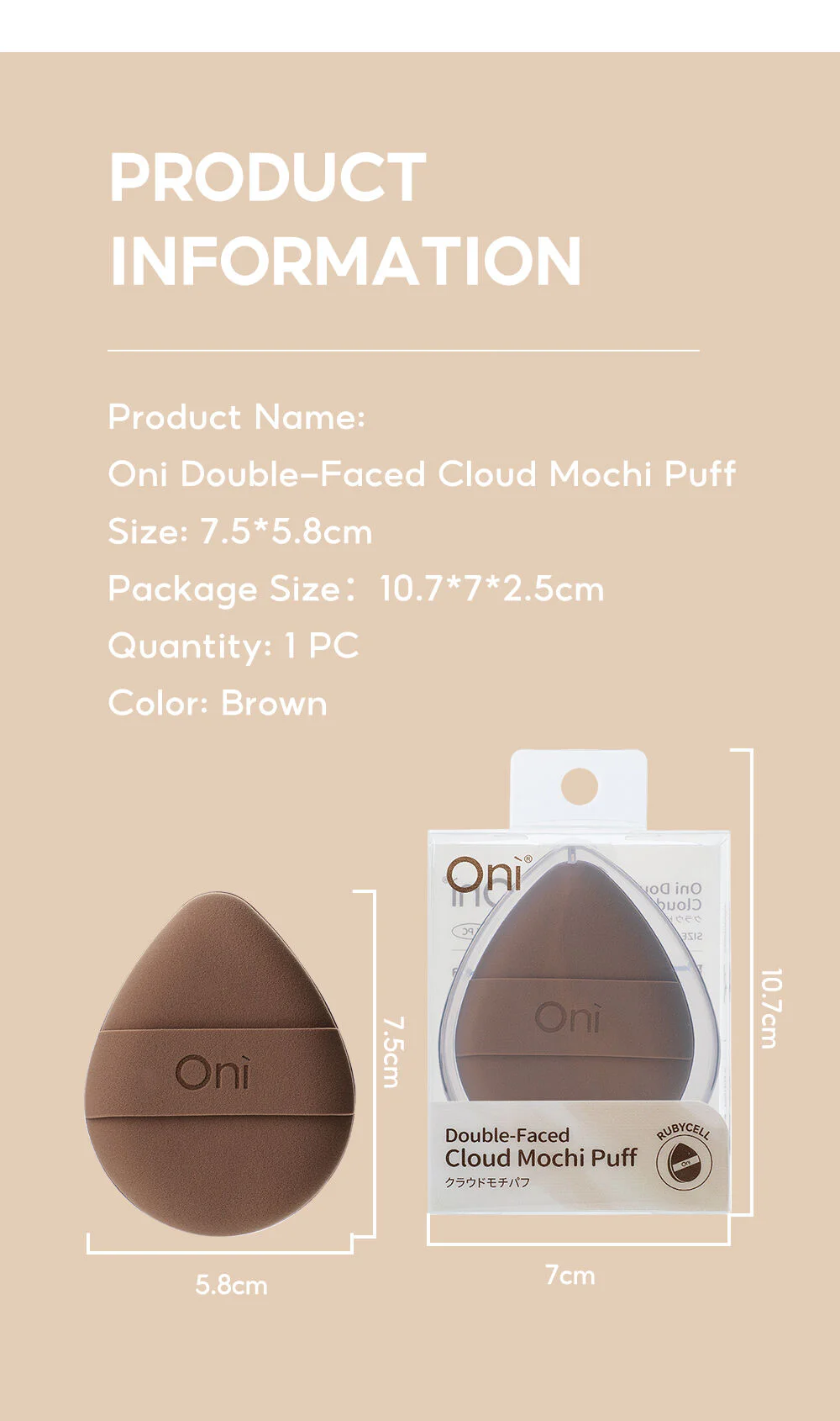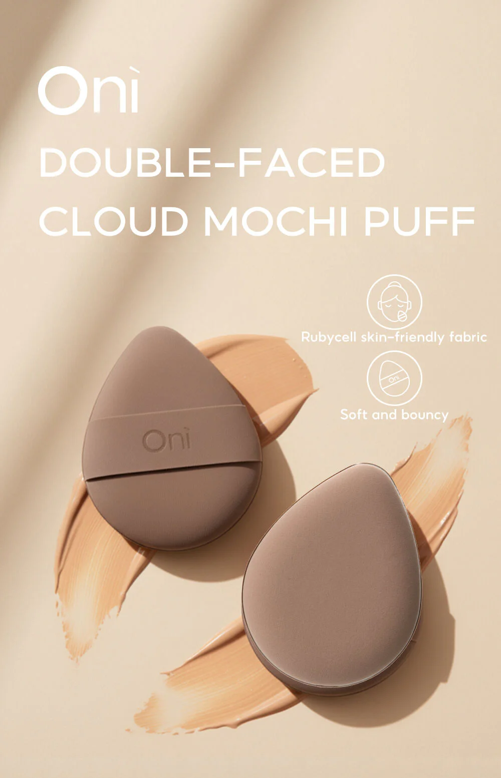 Oni Double-Faced Cloud Mochi Puff #Brown This brown Mochi makeup puff is made from Rubycell material, offering a soft, bouncy texture that won't irritate the skin. It features a double-faced design for versatile and long-lasting use, helping to apply makeup smoothly, evenly, and naturally.