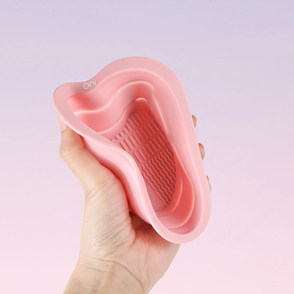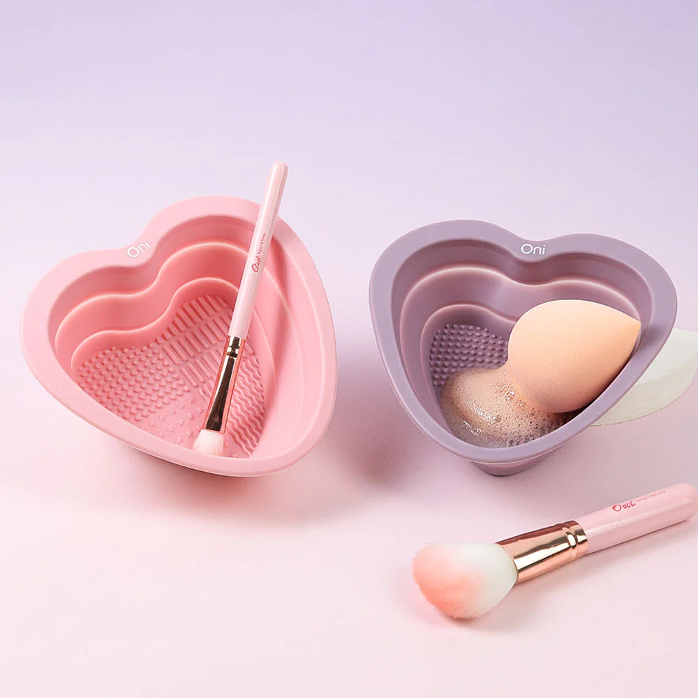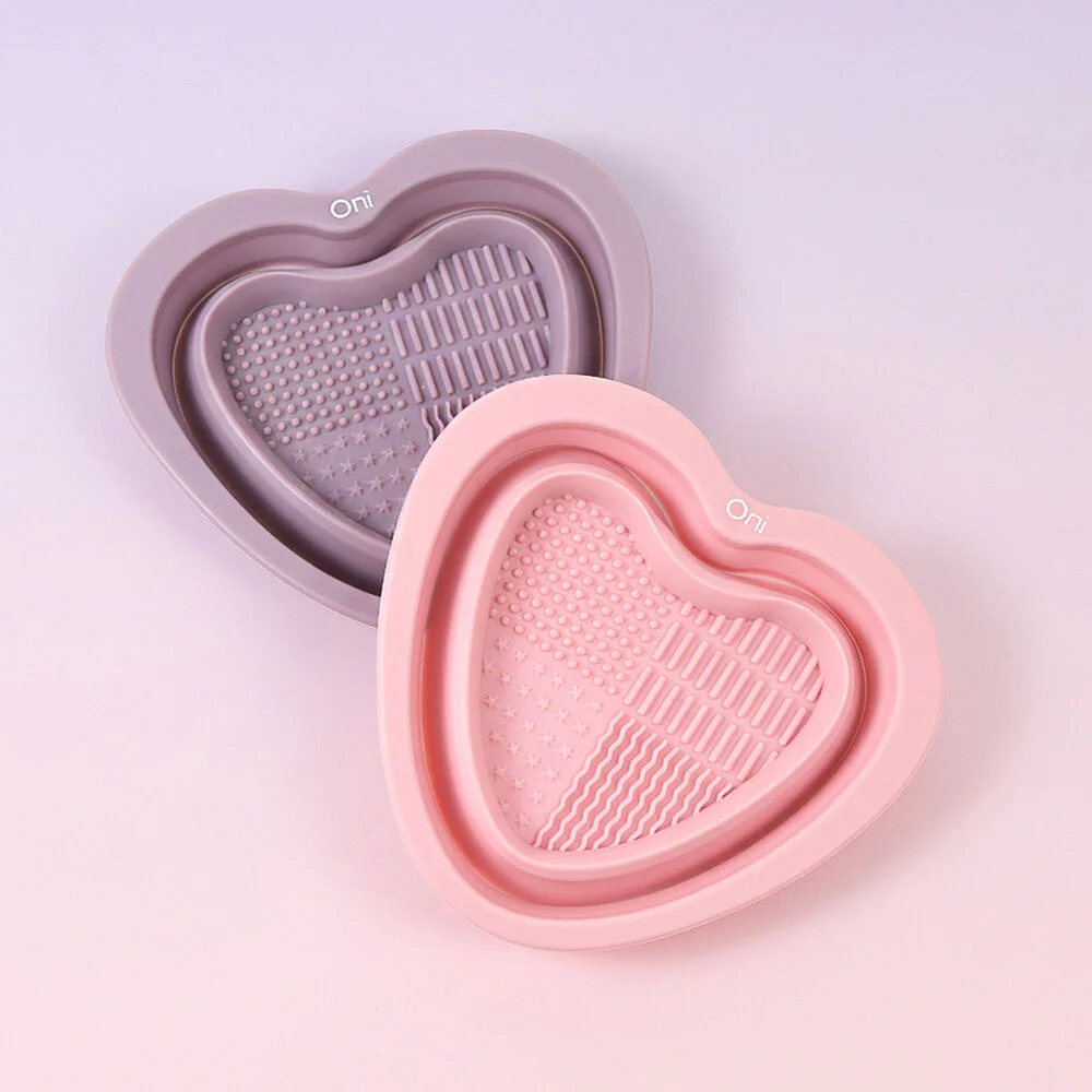 Oni Makeup Brush Cleansing Bowl Heart #Lavender Purple This heart-shaped makeup brush cleaning bowl in lavender purple is made from high-quality silicone and is designed to help remove makeup and dirt from brushes deeply and gently. It also features a foldable design for easy storage and portability.