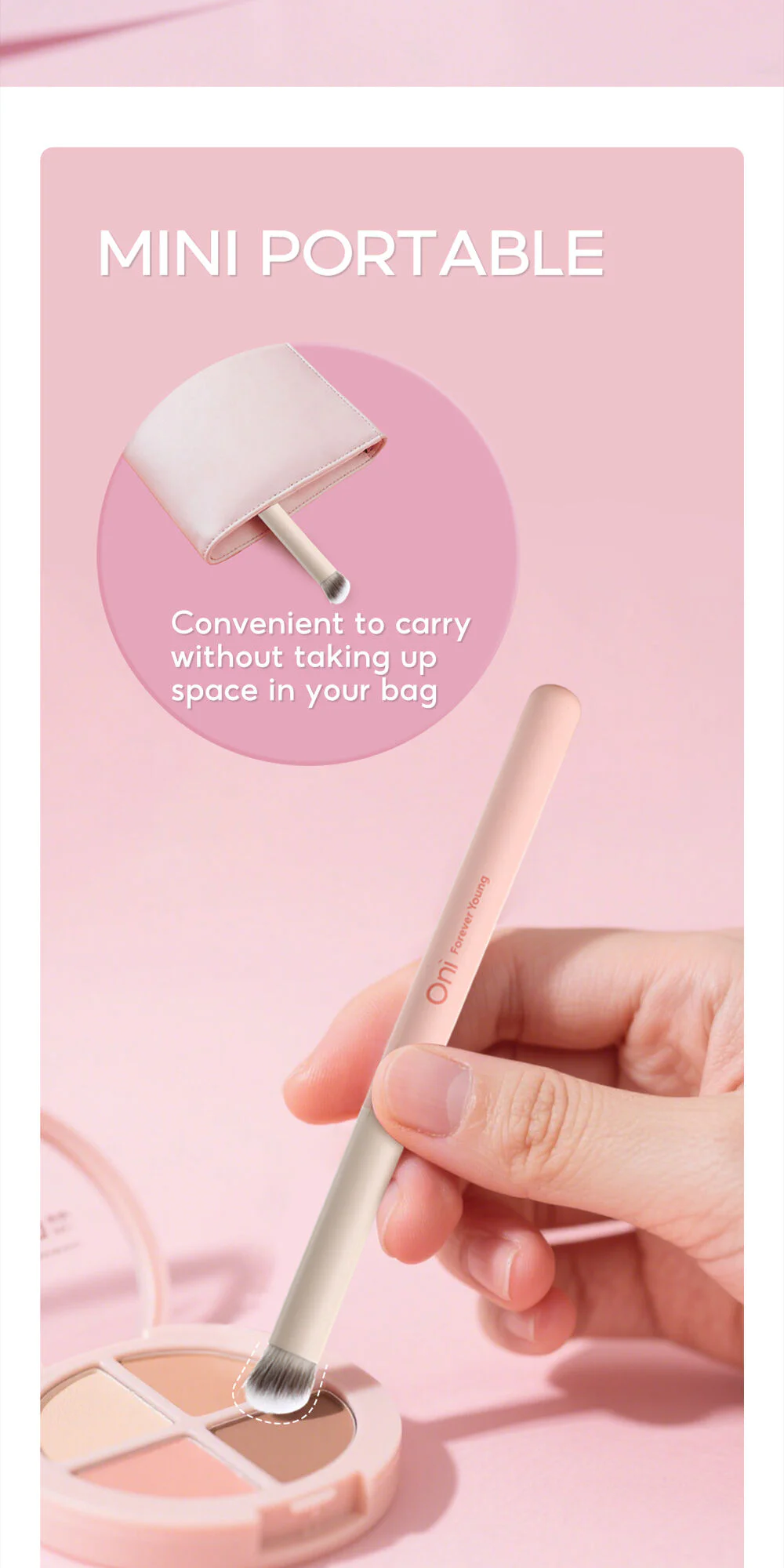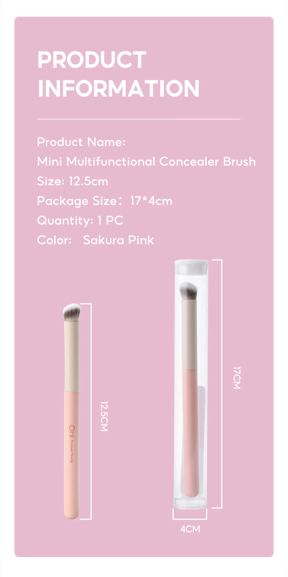 Oni Mini Multifunctional Concealer Brush #Sakura Pink Elevate your complexion for a flawless finish with the Oni Multi-Functional Concealer Brush in a mini sized sakura pink color. The soft, dense bristles won't scratch the skin and provide smooth coverage. The brush handle has a minimalist design, is lightweight, and easy to grip, making detailed makeup application a breeze.