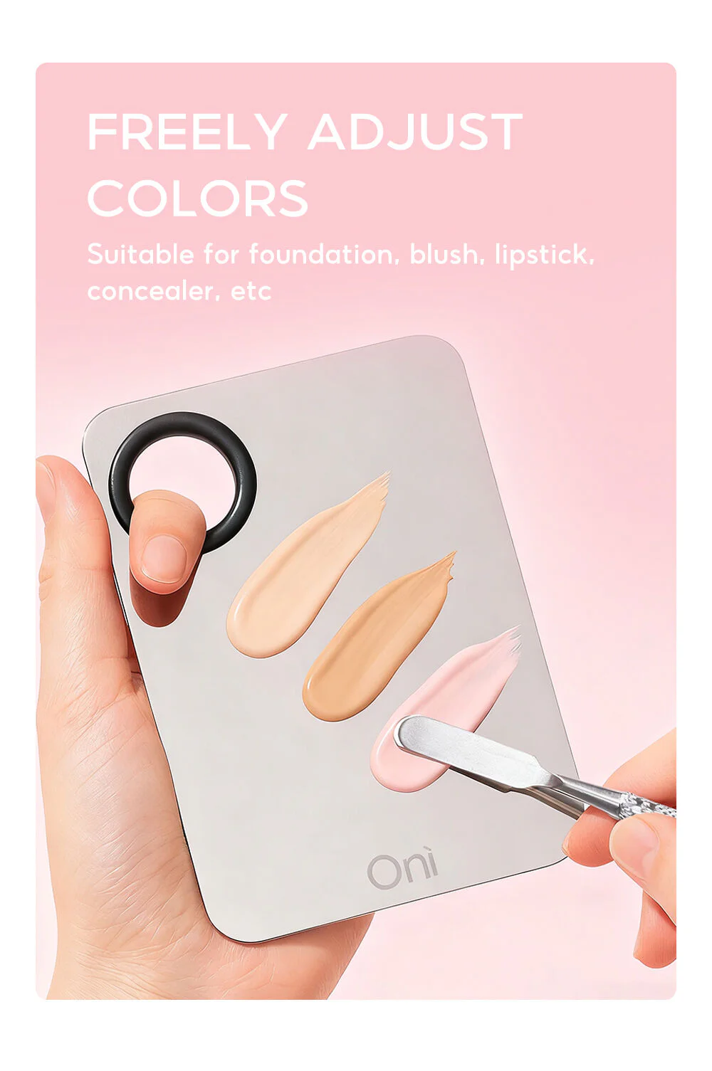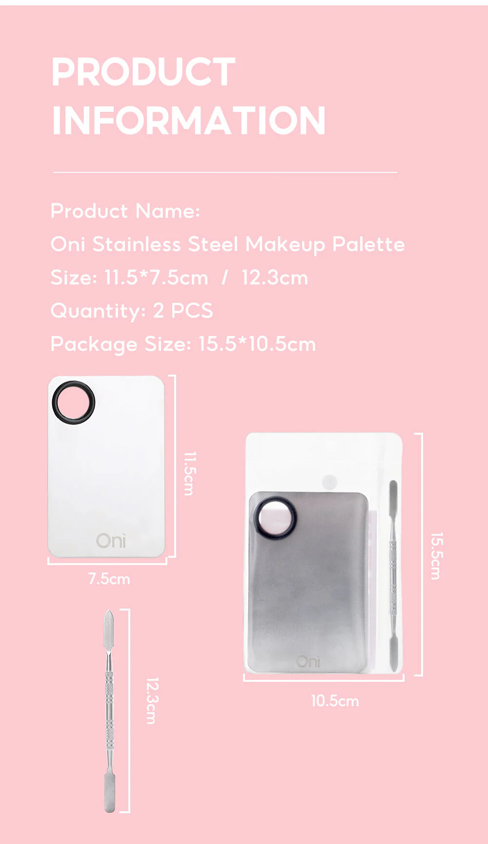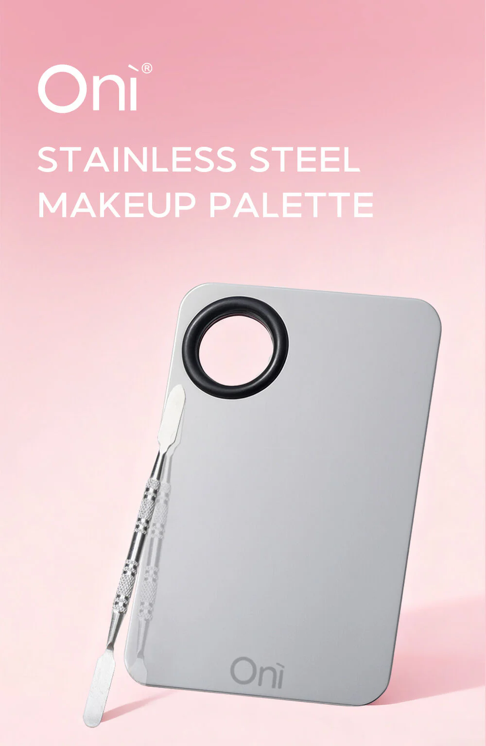 Oni Stainless Steel Makeup Palette This stainless steel makeup palette features a ring design for a comfortable grip. It's designed for mixing and preparing makeup for multiple purposes, including foundation, concealer, cream blush, and lipstick. It comes with a stainless steel spatula for convenient, hygienic use.