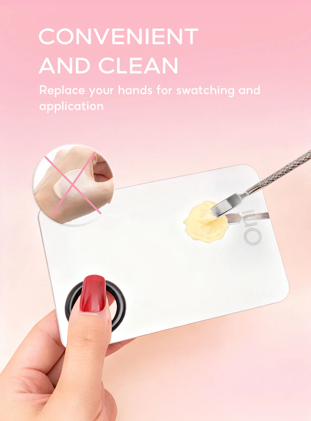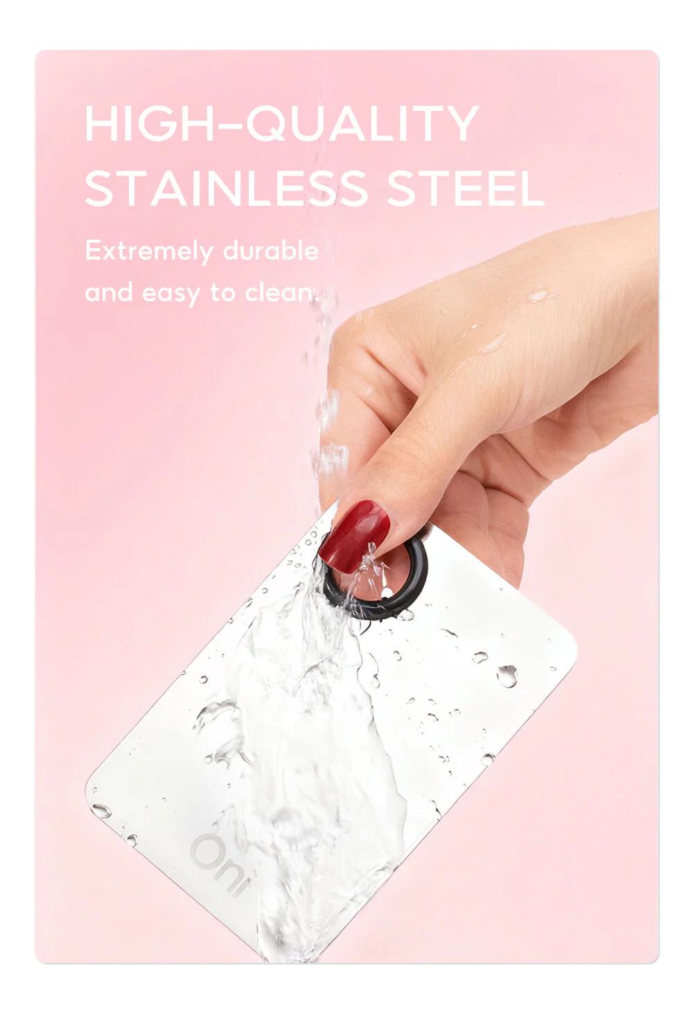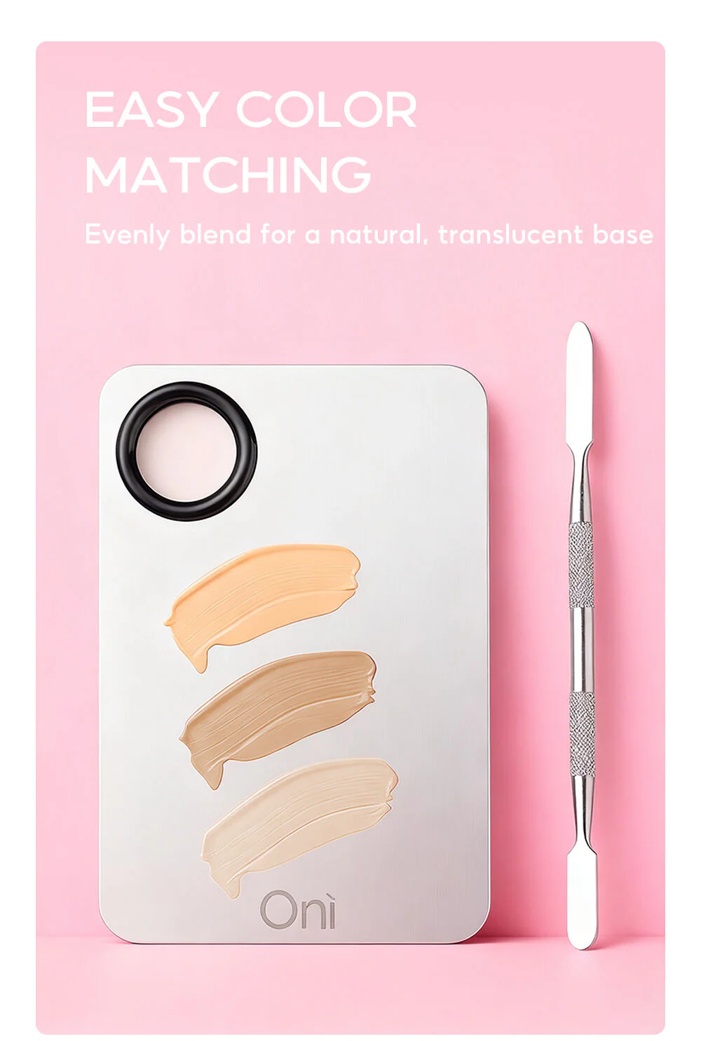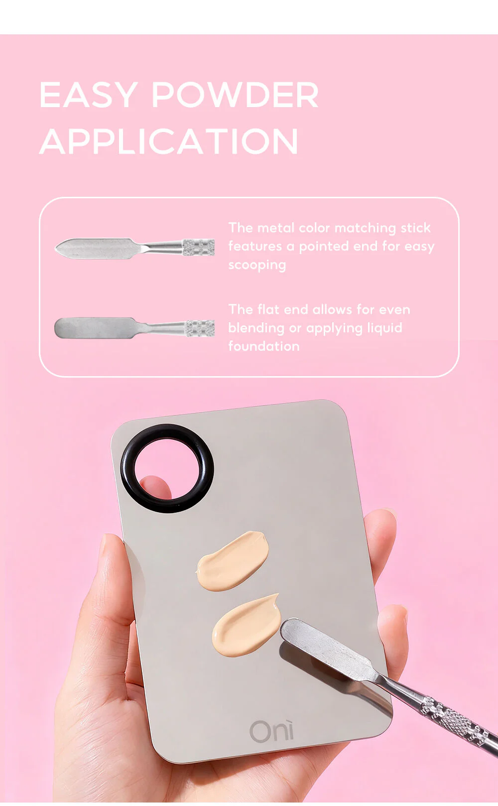 Oni Stainless Steel Makeup Palette This stainless steel makeup palette features a ring design for a comfortable grip. It's designed for mixing and preparing makeup for multiple purposes, including foundation, concealer, cream blush, and lipstick. It comes with a stainless steel spatula for convenient, hygienic use.