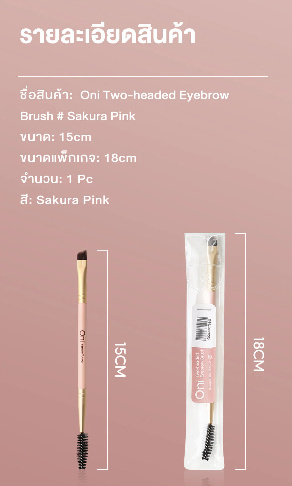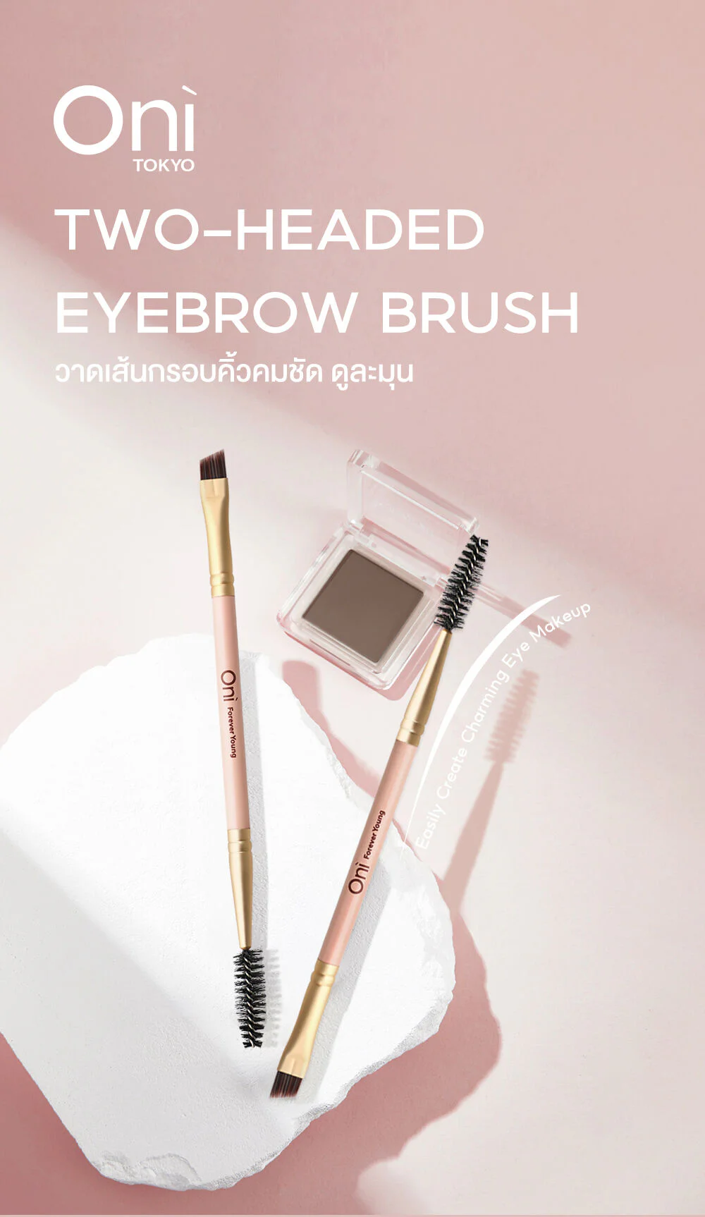 Oni Two-headed Eyebrow Brush #Sakura Pink Perfect eyebrow shape with a Sakura pink eyebrow brush. The design is very elegant. The synthetic hair is of good quality, soft and fine, does not hurt the skin. The slanted tip shape makes it easy to draw eyebrows. It comes with a brush to help blend the eyebrows for beautiful, natural eyebrows.