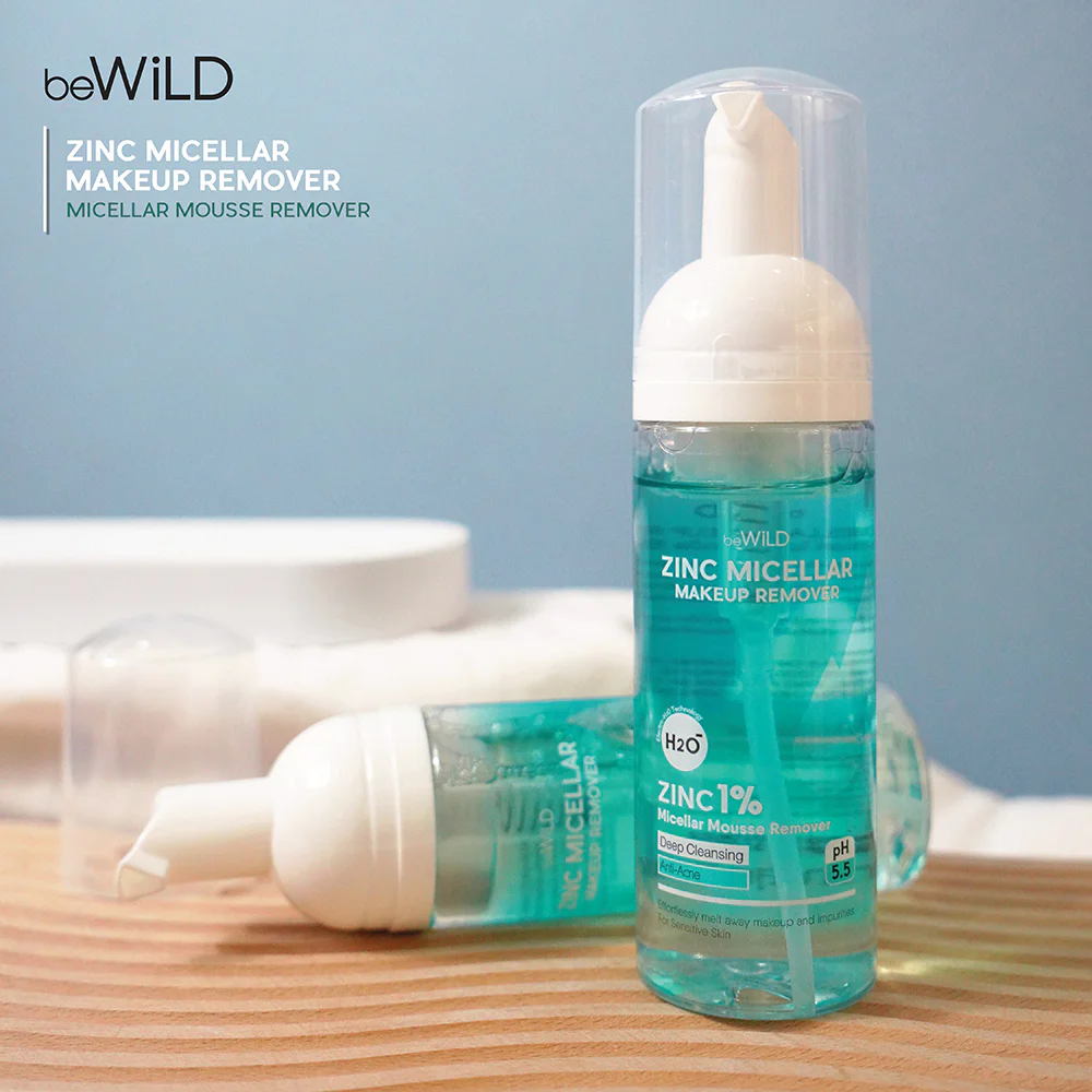 beWiLD Zinc Micellar Makeup Remover 160ml A soft mousse-textured makeup remover that removes dirt, makeup residue, and even waterproof products very well with the cleaning power of micelles and Electro - H2O Technology, an innovation that increases the depth of dirt removal with negatively charged water that has smaller molecules than general water, deeply cleaning the pores. It also has Zinc 1% that helps control oil, reduce the accumulation of bacteria that causes acne, and balances the skin with pH5.5, gentle on the face.