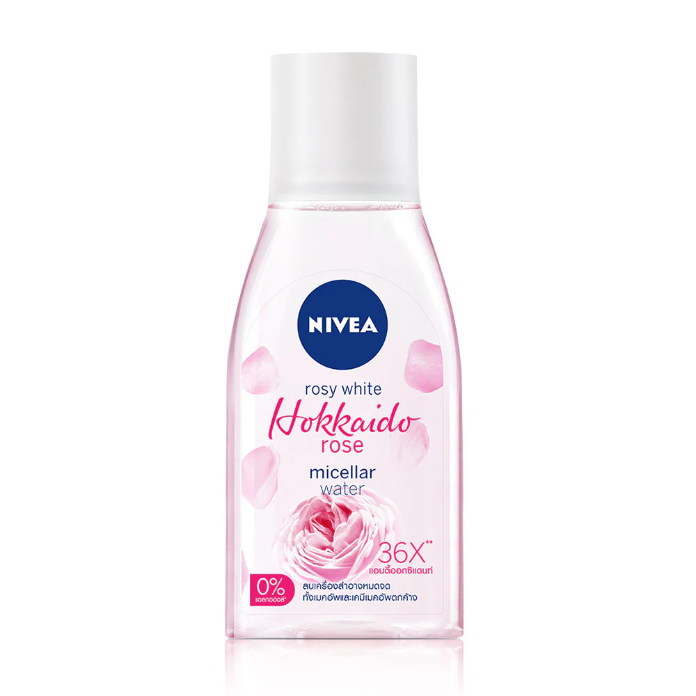 NIVEA Rosy Bright Hokkaido Rose Micellar Water 125ml A gentle makeup remover cleanser for acne-prone skin. Thoroughly cleanses pollution, makeup, and chemical makeup residue. Combined with Hokkaido Rose Serum, free from 3 types of substances that may harm the skin. Ignite the aura, making the skin look bright, juicy, and healthy.