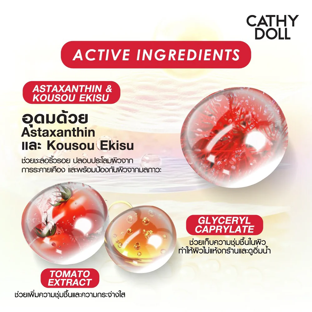 Cathy Doll Astaxanthin Serum Mask Sheet 20g Astaxanthin serum mask sheet With a facial mask sheet made from plant fibers, soft and comfortable to the touch, adhering to the skin without causing skin irritation. Free from petrochemical fibers, fluorescent agents and bleaching agents. Enriched with Astaxanthin extract, an antioxidant, and red algae extract (Kousou Ekisu) helps reduce wrinkles, soothes skin from irritation, and protects skin from pollution. Combined with Tomato Extract, it helps increase moisture and brighten the face. Glyceryl Caprylate helps maintain moisture in the skin, preventing dry skin and making it look full of water. The serum on the mask sheet is deeply absorbed into the skin, leaving it moisturized, youthful, and naturally radiant. It is free from 5 types of irritating substances: Alcohol, Paraben, Colorant, Hydroquinone, and Mineral Oil.