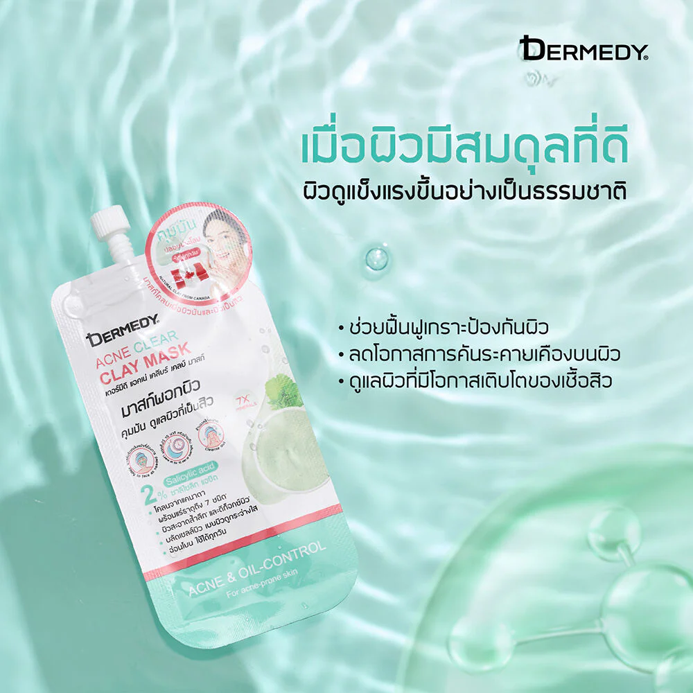 DERMEDY Acne Clear Clay Mask 5g A natural clay mask from Canada, enriched with over 7 minerals, helps remove impurities, absorb excess oil, and reduce the causes of acne. Combined with concentrated Salicylic Acid 2%, Prebio-care (Skin Prebiotic), extracts of mugwort, licorice, centella asiatica, and witch hazel, it gently exfoliates, reduces irritation, and cares for acne-prone skin. It also contains Vitamin B3, Ceramide, and aloe vera extract to reduce dark spots and redness, soothe, and strengthen the skin's protective barrier, revealing clean, smooth, healthy-looking skin.