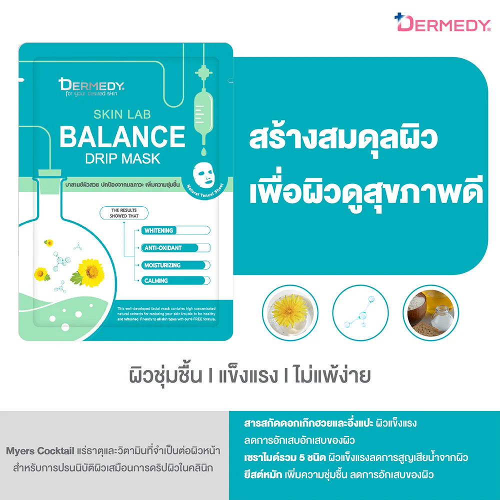 DERMEDY Skin Lab Balance Drip Mask 25g This nourishing sheet mask is formulated for balanced and healthy skin, without irritation. Based on the Myers Cocktail Therapy concept and technology from the USA, it's rich in vitamins and minerals to address various skin concerns. It combines Botaniplex Balance SC to restore skin balance and soothe, along with 5 types of Ceramide, Beta-Glucan, and Vitamin B5 to revitalize, hydrate, and strengthen the skin's protective barrier, revealing strong, healthy skin.