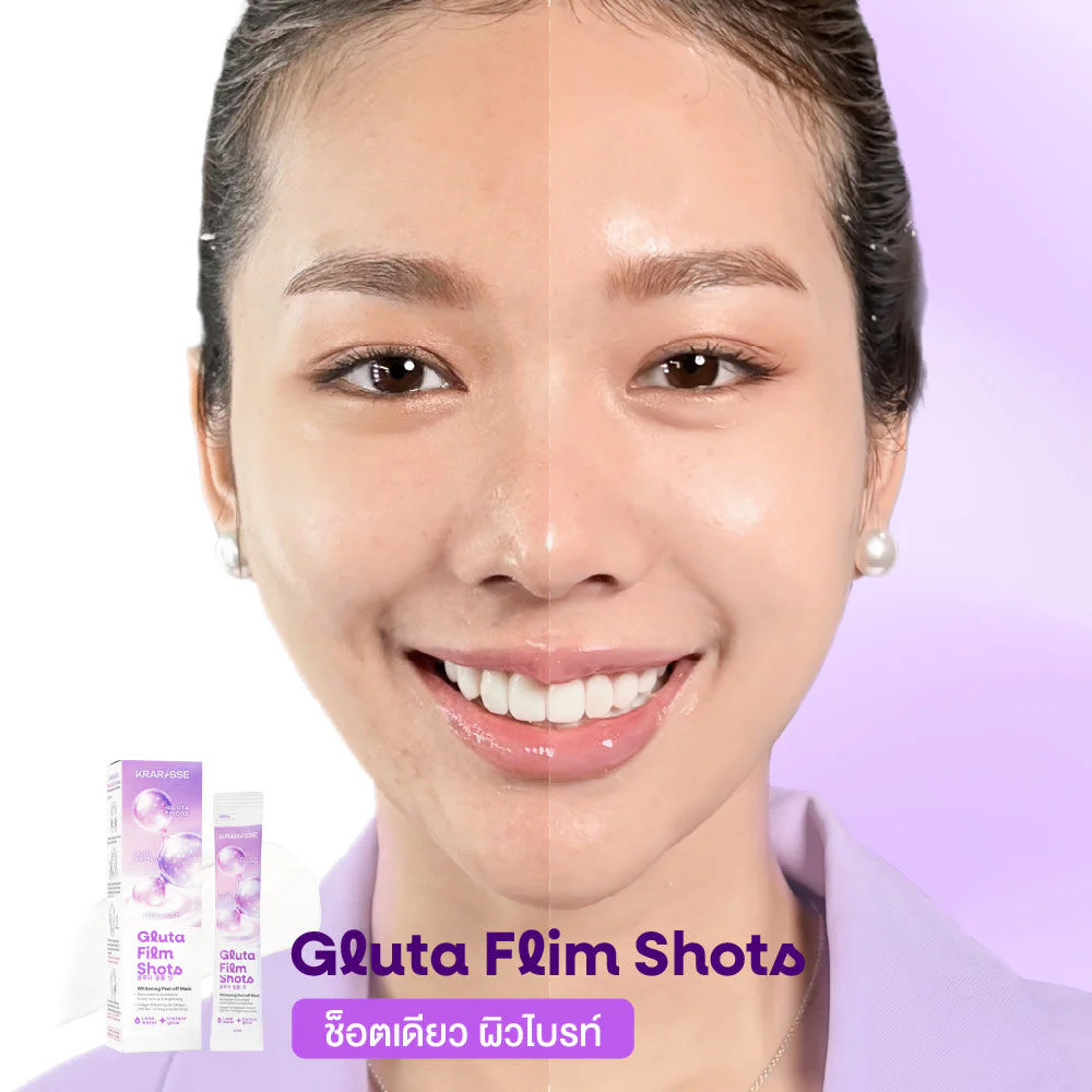 Krarisse Gluta Film Shots 40ml No-rinse peel-off mask with a gluta formula. Creamy texture that transforms into a clear film with intensive skincare innovation, combining Niacinamide and concentrated Glutathione to help even out skin tone and make it look brighter. With Collagen & Hydrolyzed Collagen, it helps deeply moisturize the skin, lifts and firms the face, and makes wrinkles appear shallower. Reveals smooth, bright skin, confident and ready to take on any situation.