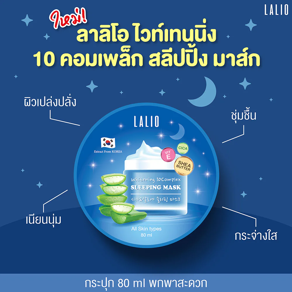 Lalio Whitening 10 Complex Sleeping Mask 80ml Wake up your skin to a new day withIntensive sleeping mask It helps replenish and lock in moisture throughout the night with the power of Hyaluronic Acid, soothes the skin with Aloe Vera and Centella, reduces irritation, adds comfort to the skin, and is packed with Whitening 10 Complex that helps the skin look brighter, dark spots fade, and the skin tone looks even and naturally radiant.