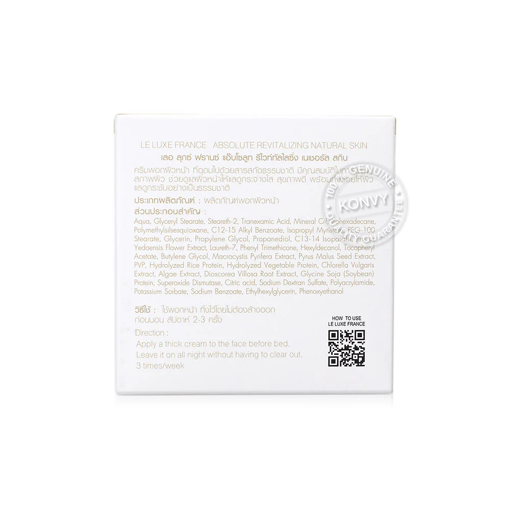 LE LUXE FRANCE Absolute Revitalizing Natural Skin 30g Facial mask cream is rich in natural extracts that help restore the skin, making it look firmer and more radiant, smooth, moisturized, and naturally healthy.