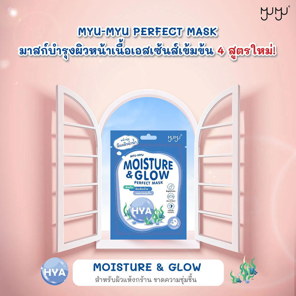 MYU-MYU Moisture & Glow Perfect Mask 25g Facial mask sheet, formulated for hydrated and plump skin. Rich essence texture, enriched with seaweed extract, Hyaluron 8D, Sodium Hyaluronate, Beta-Glucan and Allantoin help restore moisture to dry, rough skin and soothe it from environmental stressors, revealing smooth, soft, radiant, and hydrated skin.