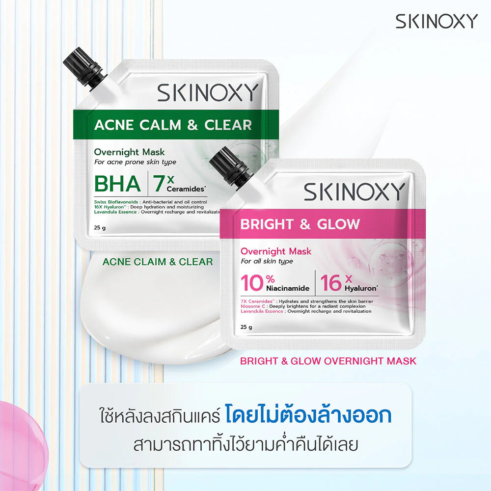 Skinoxy Bright & Glow Overnight Mask 25g Sleeping mask formula  Bright & Glow IThe gel cream is light on the skin and combines ingredients from 10% Niacinamide,Lavandula Essence and Niosome C help restore the skin to look brighter with 16X Hyaluron and 7X Ceramides help increase moisture and strengthen the skin's protective barrier, giving the skin a glowing and radiant look.