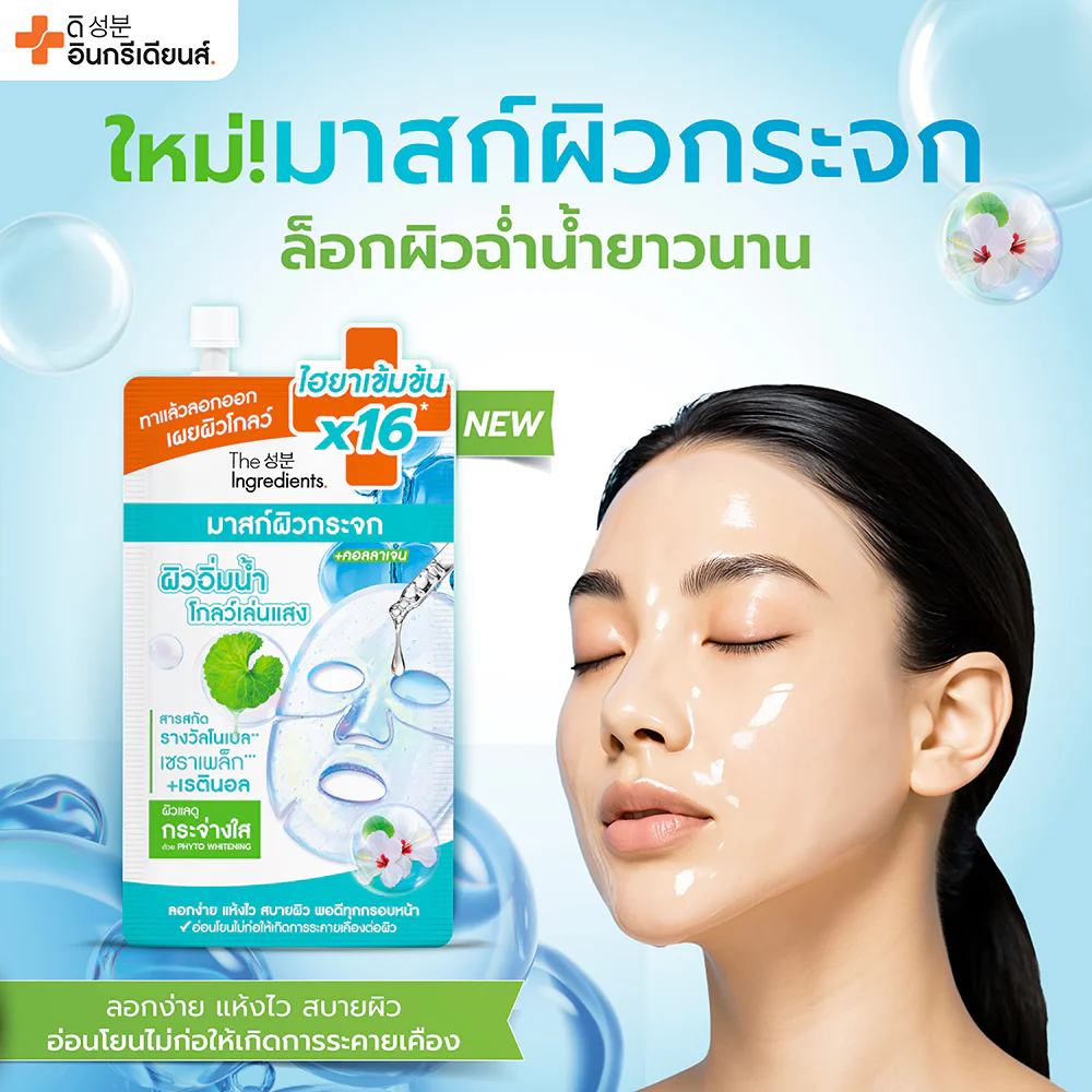 The Ingredients Glass Skin Hydro Glow Mask 10g Glass Skin Hydrogel Mask, a light film that dries quickly and peels off easily with 5 types of flower extracts from Korea that gently exfoliate the skin. Combined with 16 types of HYA, it helps deeply moisturize the skin along with Collagen, Retinol, and 7 types of Ceramide, helping the skin look firmer, revealing smooth, bouncy, hydrated, and dewy skin like Glass Skin.